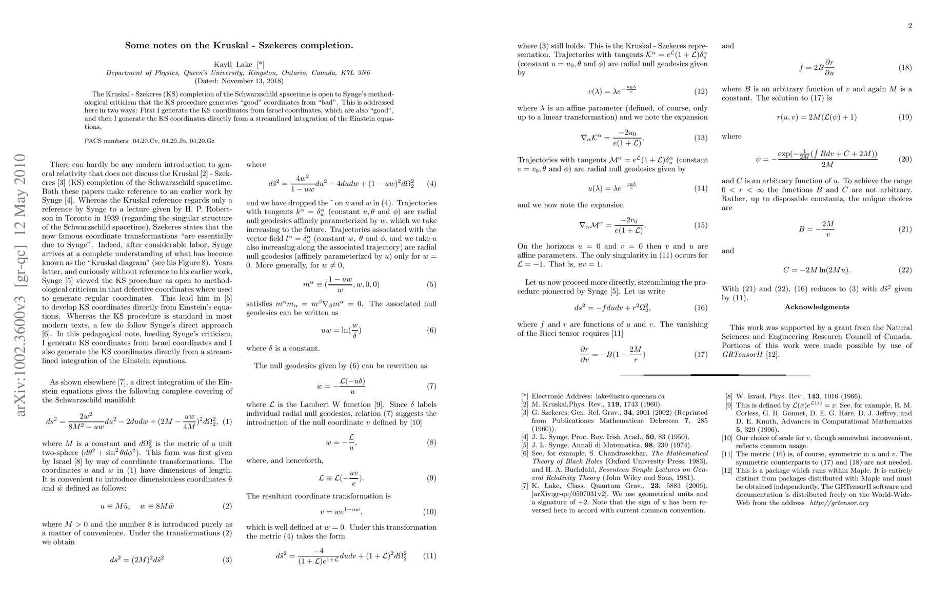 The Kruskal - Szekeres (KS) completion of the Schwarzschild spacetime is open to Synge's methodological criticism that the KS procedure generates "good" coordinates from "bad". This is addressed here in two ways: First I generate the KS coordinates from Israel coordinates, which are also "good", and then I generate the KS coordinates directly from a streamlined integration of the Einstein equations.