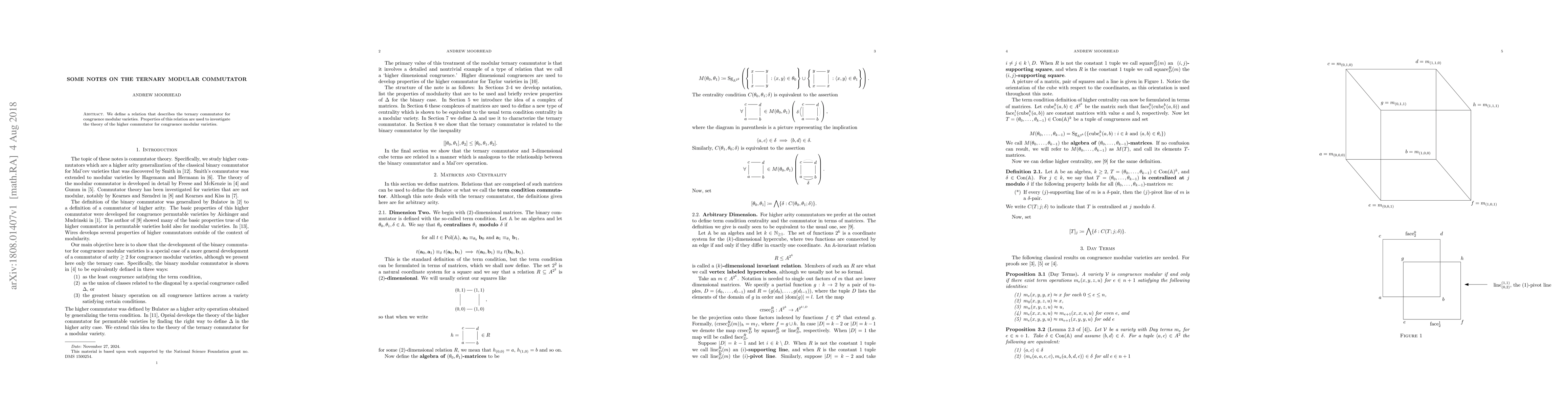 Summary: This paper introduces a ternary modular commutator relation for congruence modular varieties and explores its properties to advance the theory of higher commutators within these algebraic structures.