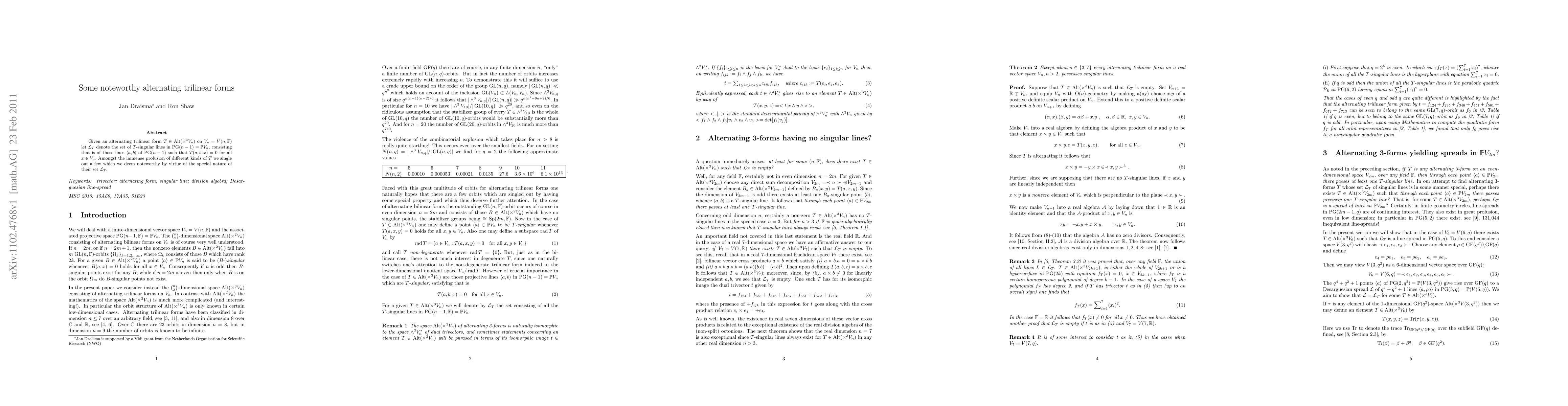This research paper identifies and analyzes specific alternating trilinear forms based on the unique characteristics of their corresponding singular line sets in projective spaces. It highlights particular forms due to the distinctive nature of L_T, offering insights into the structure and properties of these forms.