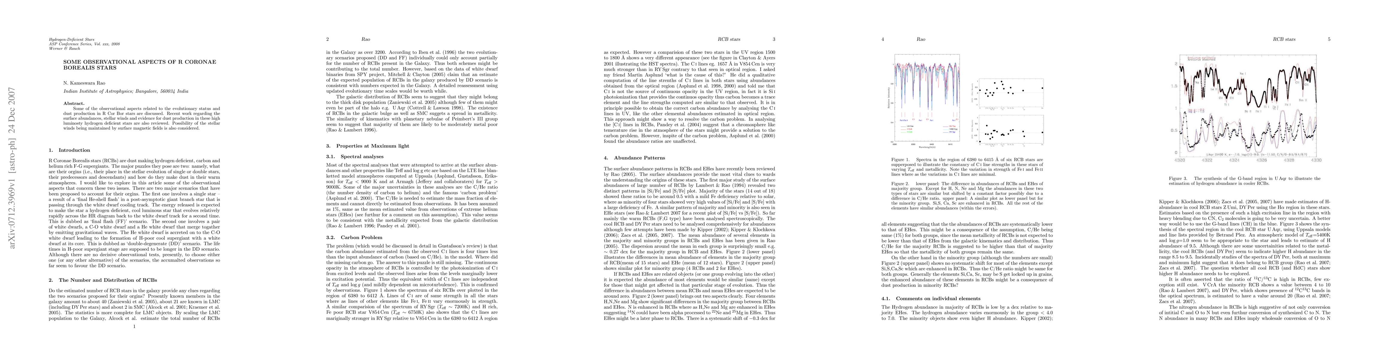 Some of the observational aspects related to the evolutionary status and dust production in R Cor Bor stars are discussed. Recent work regarding the surface abundances, stellar winds and evidence for dust production in these high luminosty hydrogen deficient stars are also reviewed. Possibility of the stellar winds being maintained by surface magnetic fields is also considered.