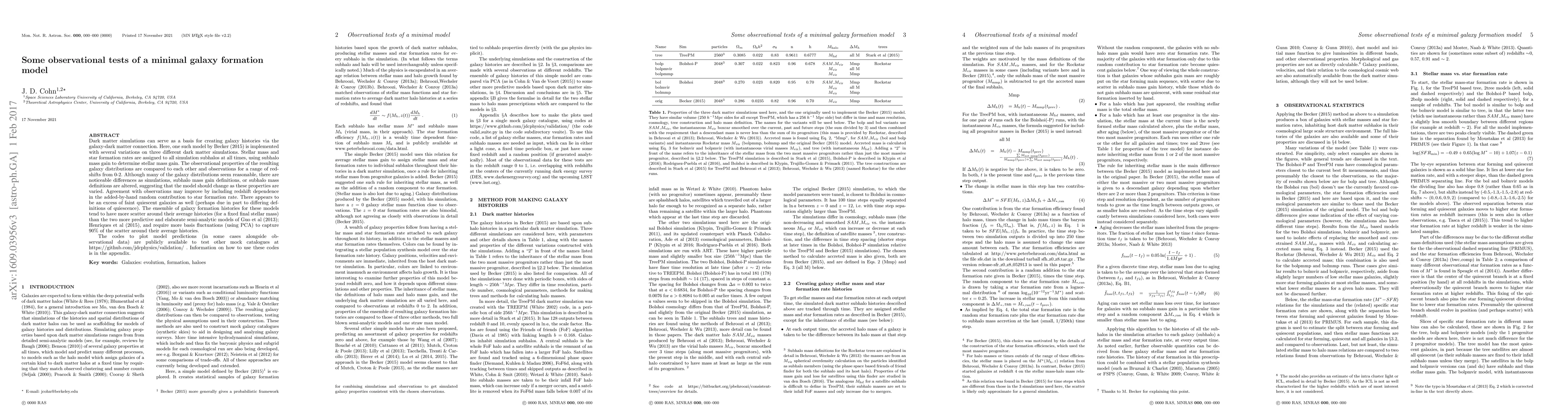 Dark matter simulations can serve as a basis for creating galaxy histories via the galaxy-dark matter connection. Here, one such model by Becker (2015) is implemented with several variations on three different dark matter simulations. Stellar mass and star formation rates are assigned to all simulation subhalos at all times, using subhalo mass gain to determine stellar mass gain. The observational properties of the resulting galaxy distributions are compared to each other and observations for a range of redshifts from 0-2. Although many of the galaxy distributions seem reasonable, there are noticeable differences as simulations, subhalo mass gain definitions, or subhalo mass definitions are altered, suggesting that the model should change as these properties are varied. Agreement with observations may improve by including redshift dependence in the added-by-hand random contribution to star formation rate. There appears to be an excess of faint quiescent galaxies as well (perhaps due in part to differing definitions of quiescence). The ensemble of galaxy formation histories for these models tend to have more scatter around their average histories (for a fixed final stellar mass) than the two more predictive and elaborate semi-analytic models of Guo et al (2013) and Henriques et al (2015), and require more basis fluctuations (using PCA) to capture 90 percent of the scatter around their average histories. The codes to plot model predictions (in some cases alongside observational data) are publicly available to test other mock catalogues at https://github.com/jdcphysics/validation . Information on how to use these codes is in the appendix.