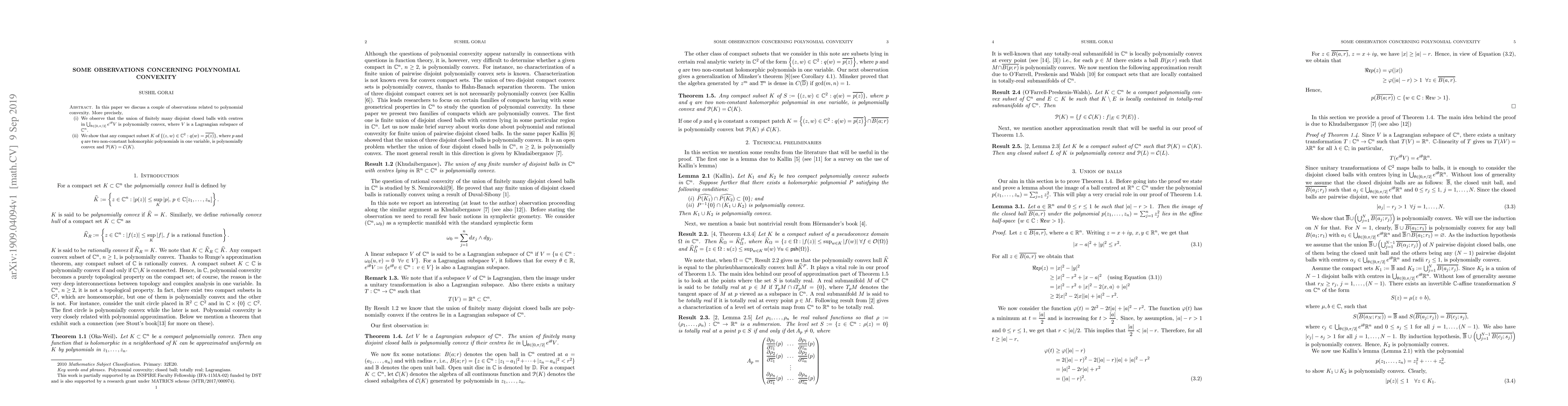 This paper observes two aspects of polynomial convexity: (i) the union of finitely many disjoint closed balls centered in a specific set is polynomially convex, and (ii) any compact subset of a particular complex set defined by holomorphic polynomials is polynomially convex with equal polynomial and continuous approximations.