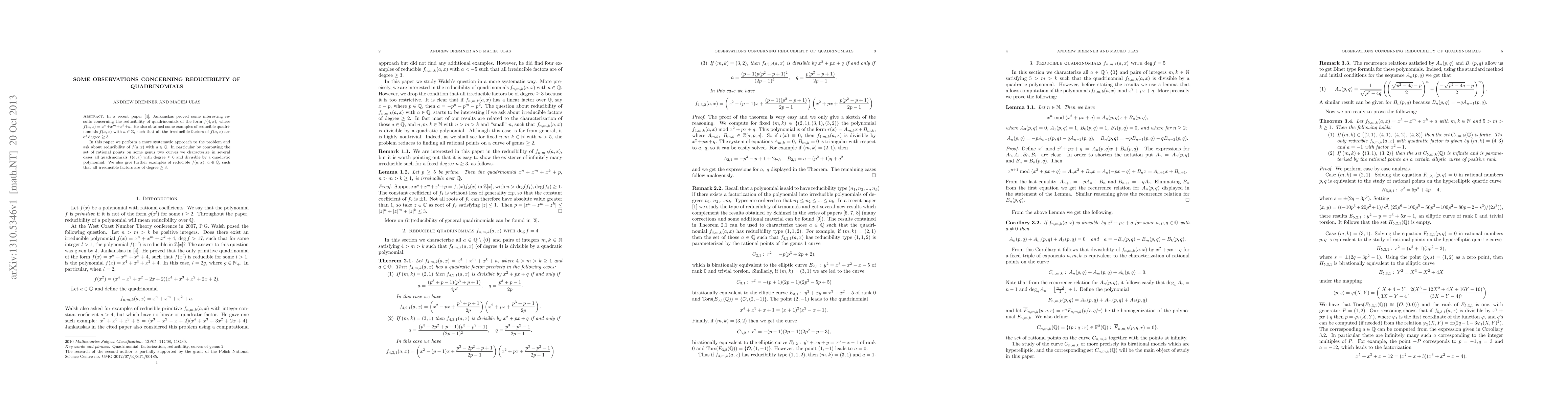 The paper employs a systematic approach to study the reducibility of quadrinomials of the form $f(a,x) = x^n + x^m + x^k + a$, focusing on cases where $a \in \Q$ and examining quadrinomials of degree $\leq 6$ divisible by a quadratic polynomial.