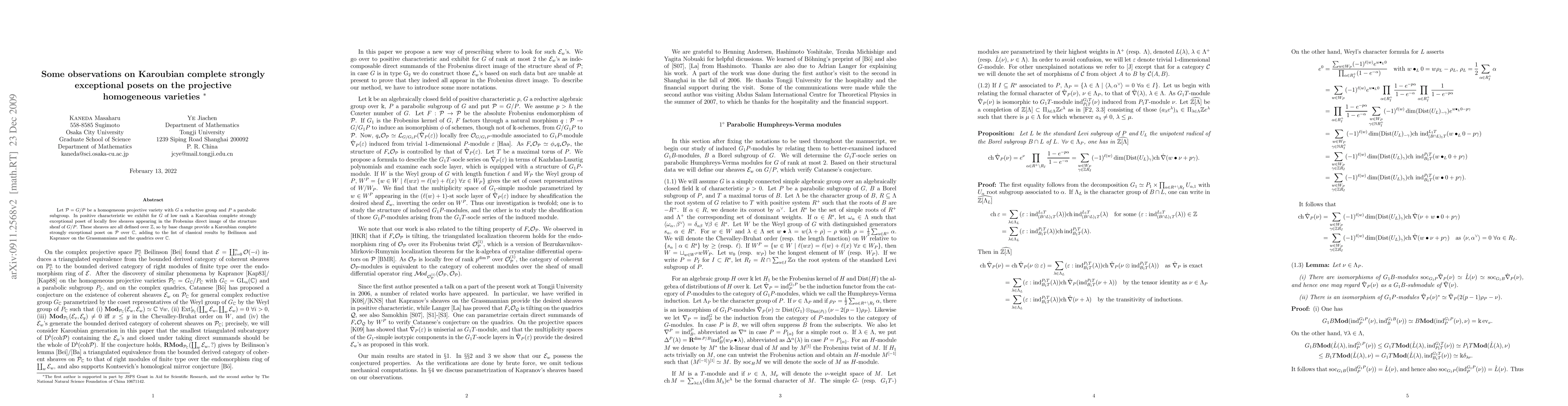 Let $\cP=G/P$ be a homogeneous projective variety with $G$ a reductive group and $P$ a parabolic subgroup. In positive characteristic we exhibit for $G$ of low rank a Karoubian complete strongly exceptional poset of locally free sheaves appearing in the Frobenius direct image of the structure sheaf of $G/P$. These sheaves are all defined over $\bbZ$, so by base change provide a Karoubian complete strongly exceptional poset on $\cP$ over $\bbC$, adding to the list of classical results by Beilinson and Kapranov on the Grassmannians and the quadrics over $\bbC$.