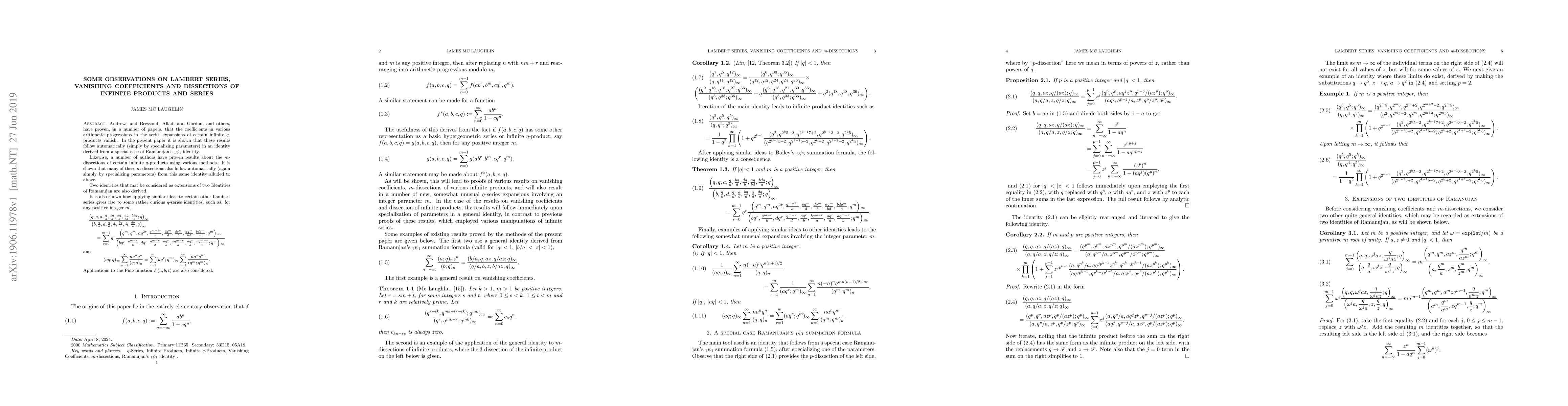 Andrews and Bressoud, Alladi and Gordon, and others, have proven, in a number of papers, that the coefficients in various arithmetic progressions in the series expansions of certain infinite $q$-products vanish. In the present paper it is shown that these results follow automatically (simply by specializing parameters) in an identity derived from a special case of Ramanujan's $_1\psi_1$ identity. Likewise, a number of authors have proven results about the $m$-dissections of certain infinite $q$-products using various methods. It is shown that many of these $m$-dissections also follow automatically (again simply by specializing parameters) from this same identity alluded to above. Two identities that mat be considered as extensions of two Identities of Ramanujan are also derived. It is also shown how applying similar ideas to certain other Lambert series gives rise to some rather curious $q$-series identities, such as, for any positive integer $m$, \begin{multline*} {\displaystyle \frac{\left(q,q,a,\frac{q}{a},\frac{b q}{d}, \frac{dq}{b}, \frac{aq}{b d}, \frac{b d q}{a};q\right)_{\infty }} {\left(b,\frac{q}{b},d,\frac{q}{d},\frac{a}{b},\frac{bq}{a},\frac{a}{d},\frac{dq}{a};q\right)_{\infty }}} = \sum _{r=0}^{m-1} q^r \frac{ \left(q^m,q^m,a q^{2 r},\frac{q^{m-2 r}}{a},\frac{b q^m}{d},\frac{d q^m}{b}, \frac{a q^m}{b d},\frac{b dq^m}{a};q^m\right){}_{\infty }} {\left(b q^r,\frac{q^{m-r}}{b},d q^r,\frac{q^{m-r}}{d},\frac{a q^r}{b},\frac{b q^{m-r}}{a},\frac{a q^r}{d}, \frac{dq^{m-r}}{a};q^m\right){}_{\infty }} \end{multline*} and \begin{equation*} (aq;q)_{\infty}\sum_{n=1}^{\infty} \frac{n a^n q^{n}}{(q;q)_n} = \sum_{r=1}^{m}(aq^{r};q^m)_{\infty}\sum_{n=1}^{\infty} \frac{na^n q^{n r}}{(q^m;q^m)_n}. \end{equation*} Applications to the Fine function $F(a,b;t)$ are also considered.