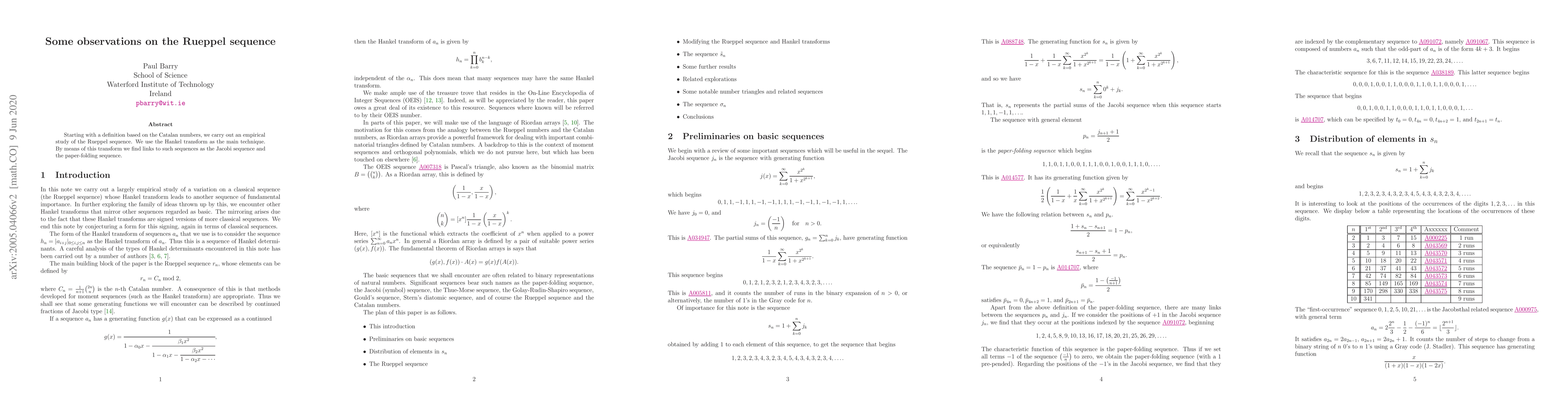 Starting with a definition based on the Catalan numbers, we carry out an empirical study of the Rueppel sequence. We use the Hankel transform as the main technique. By means of this transform we find links to such sequences as the Jacobi sequence and the paper-folding sequence. We also study several number arrays defined by this sequence, which are analogs of the important Catalan triangles of combinatorics. We identify a sequence related to the Golay-Rudin-Shapiro sequence that plays a fundamental role in linking the Hankel transforms of the paper with classical sequences. Examples are given where certain privileged permutations appearing in the Leibnitz formula for determinants have a special role.