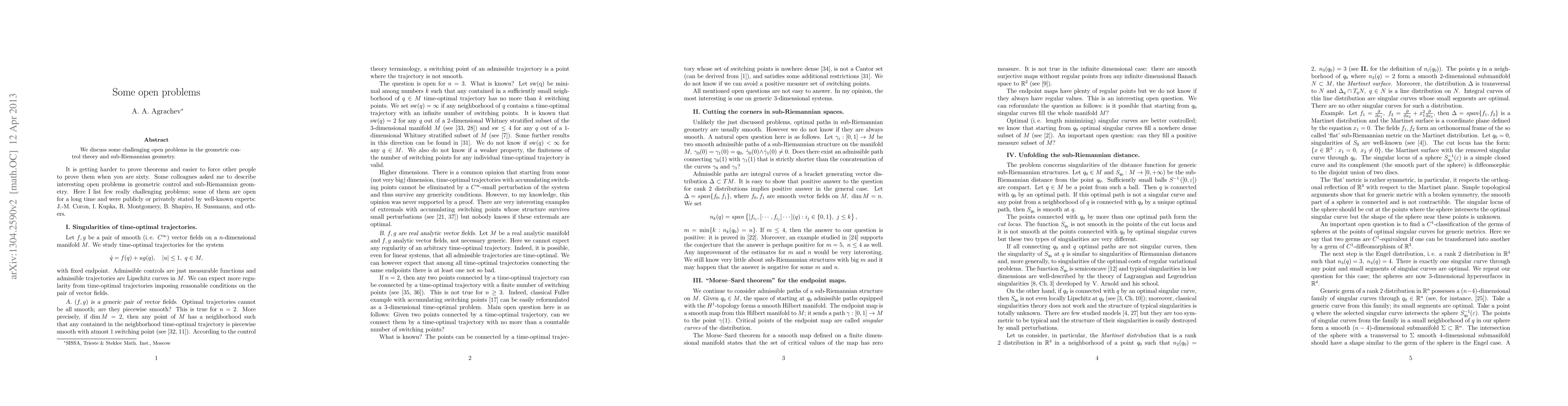**Summary:** This paper identifies and discusses several open problems in the fields of geometric control theory and sub-Riemannian geometry, highlighting areas that require further research and exploration.