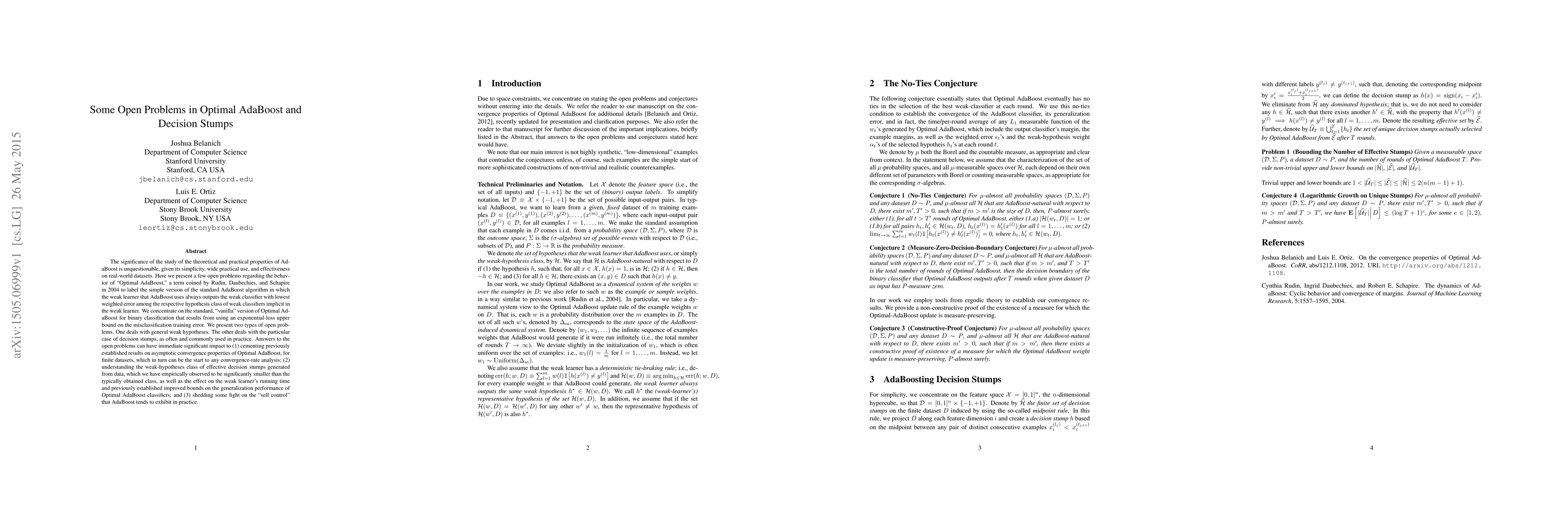 This paper identifies open problems concerning the theoretical and practical properties of Optimal AdaBoost, focusing on its behavior with decision stumps. It aims to address questions that could enhance understanding of convergence properties, the effective decision stumps class, and the practical "self-control" exhibited by AdaBoost.