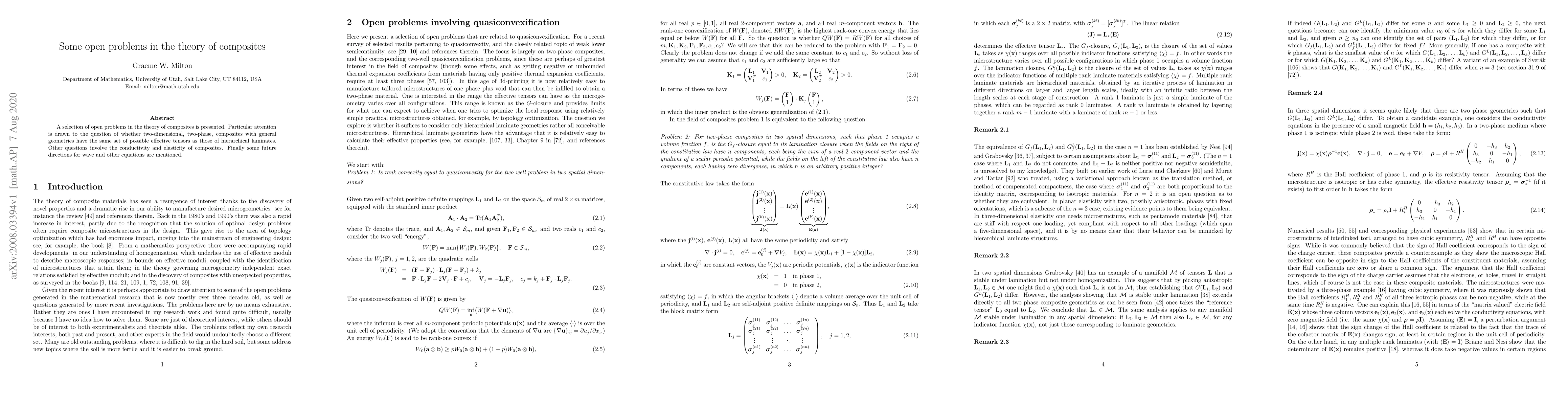 A selection of open problems in the theory of composites is presented. Particular attention is drawn to the question of whether two-dimensional, two-phase, composites with general geometries have the same set of possible effective tensors as those of hierarchical laminates. Other questions involve the conductivity and elasticity of composites. Finally, some future directions for wave and other equations are mentioned.