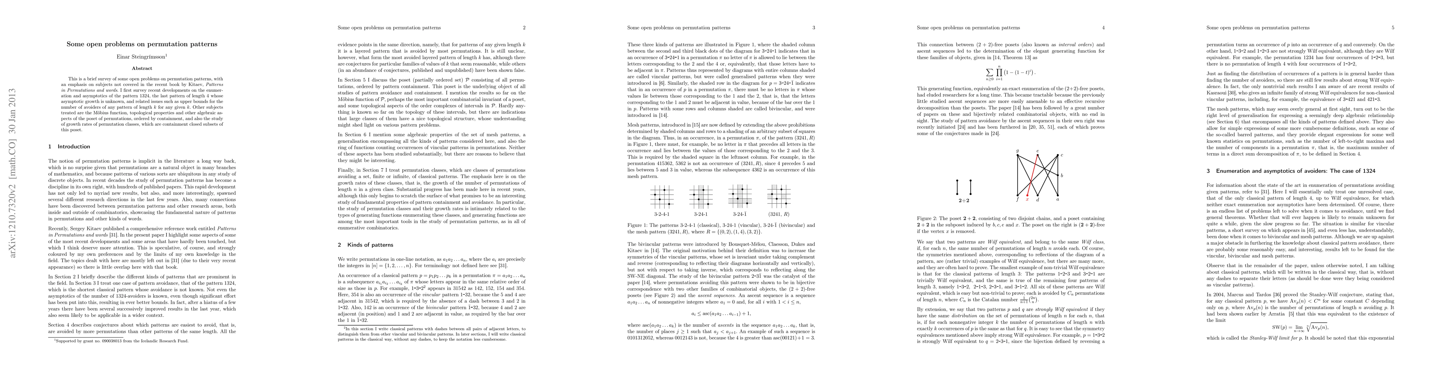 This paper surveys open problems in permutation patterns, focusing on the unknown asymptotic growth of the pattern 1324 and related enumeration issues. It also covers the Möbius function, topological properties, and algebraic aspects of permutation posets, as well as growth rates of permutation classes.