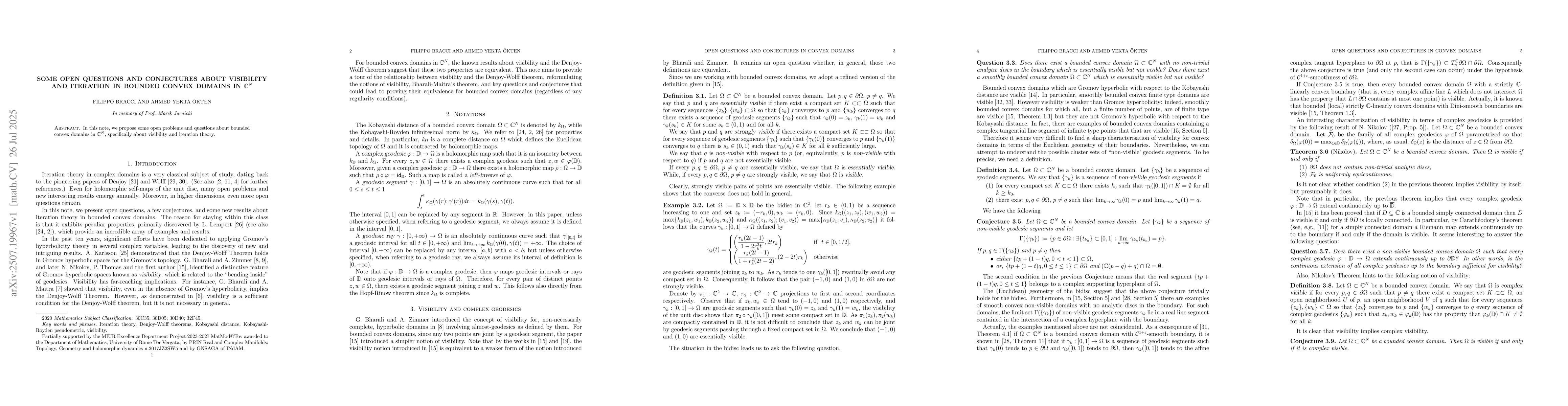 This paper presents open questions and conjectures regarding visibility and iteration theory in bounded convex domains within complex N-space, $mathbb C^N$. It aims to stimulate further research in this area.