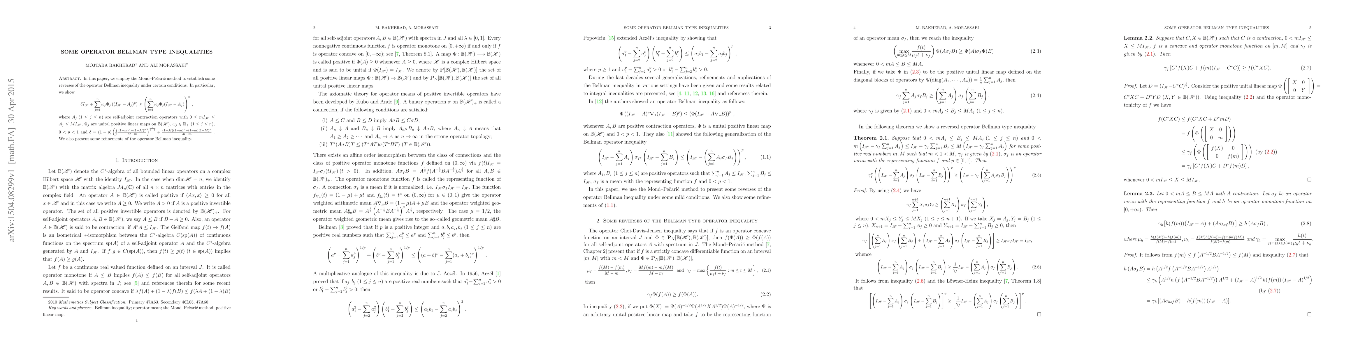 In this paper, we employ the Mond--Pe\v{c}ari\'c method to establish some reverses of the operator Bellman inequality under certain conditions. In particular, we show \begin{equation*} \delta I_{\mathscr K}+\sum_{j=1}^n\omega_j\Phi_j\left((I_{\mathscr H}-A_j)^{p}\right)\ge \left(\sum_{j=1}^n\omega_j\Phi_j(I_{\mathscr H}-A_j)\right)^{p} \,, \end{equation*} where $A_j\,\,(1\leq j\leq n)$ are self-adjoint contraction operators with $0\leq mI_{\mathscr H}\le A_j \le MI_{\mathscr H}$, $\Phi_j$ are unital positive linear maps on ${\mathbb B}({\mathscr H})$, $\omega_j\in\mathbb R_+ \,\,(1\leq j\leq n)$, $0 < p < 1$ and $\delta=(1-p)\left(\frac{1}{p}\frac{(1-m)^p-(1-M)^p}{M-m}\right)^{\frac{p}{p-1}}+\frac{(1-M)(1-m)^p-(1-m)(1-M)^p}{M-m}$ . We also present some refinements of the operator Bellman inequality.