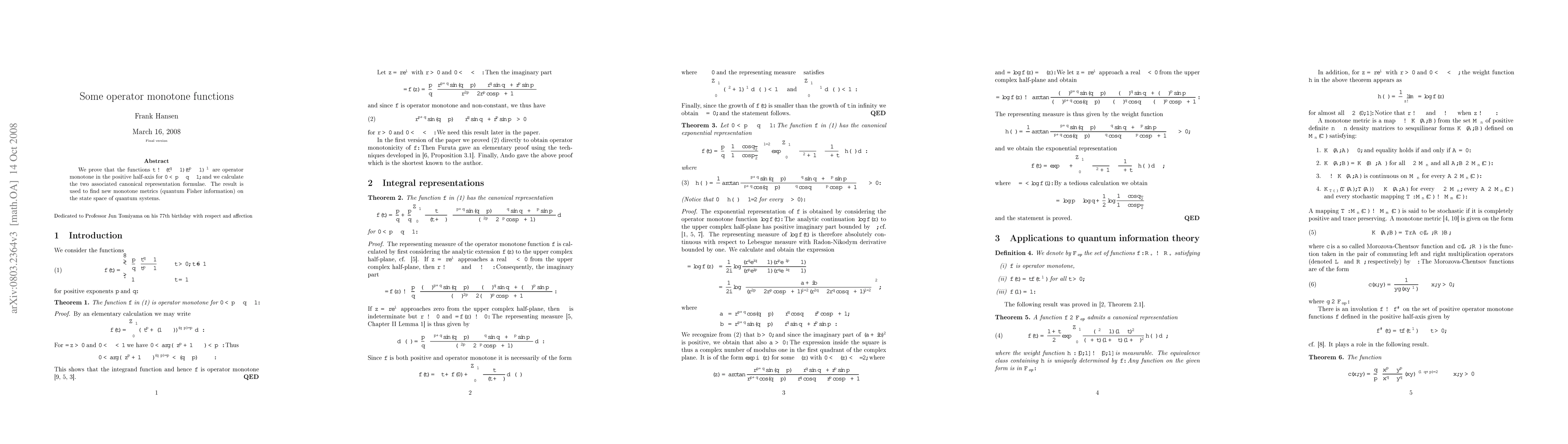 We prove that the functions t -> (t^q-1)(t^p-1)^{-1} are operator monotone in the positive half-axis for 0 < p < q < 1, and we calculate the two associated canonical representation formulae. The result is used to find new monotone metrics (quantum Fisher information) on the state space of quantum systems.