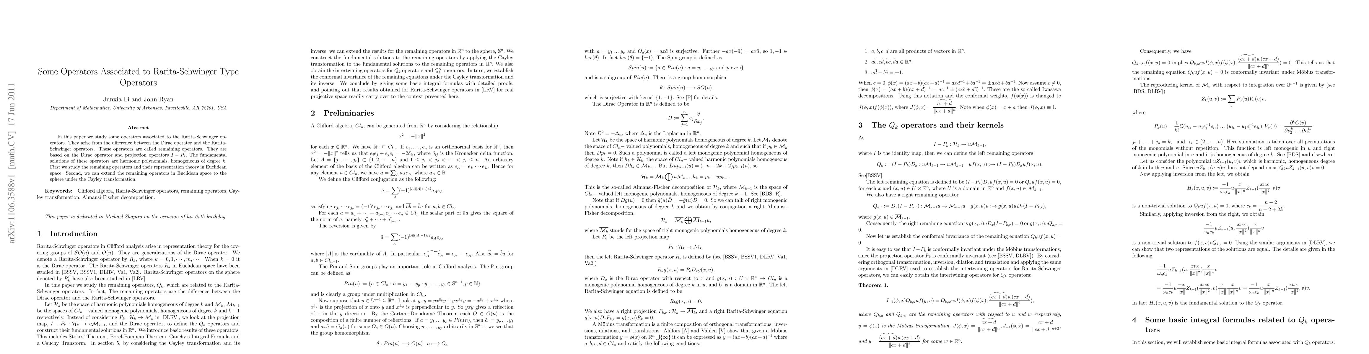 In this paper we study some operators associated to the Rarita-Schwinger operators. They arise from the difference between the Dirac operator and the Rarita-Schwinger operators. These operators are called remaining operators. They are based on the Dirac operator and projection operators $I-P_k.$ The fundamental solutions of these operators are harmonic polynomials, homogeneous of degree $k$. First we study the remaining operators and their representation theory in Euclidean space. Second, we can extend the remaining operators in Euclidean space to the sphere under the Cayley transformation.