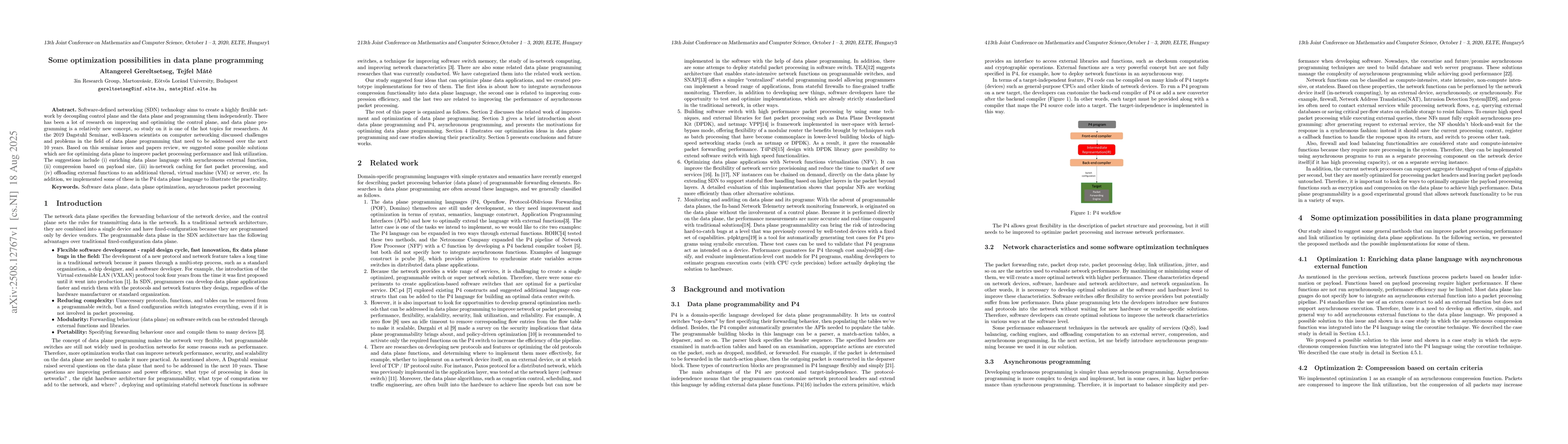 Software-defined networking (SDN) technology aims to create a highly flexible network by decoupling control plane and the data plane and programming them independently. There has been a lot of research on improving and optimizing the control plane, and data plane programming is a relatively new concept, so study on it is one of the hot topics for researchers. At the 2019 Dagstuhl Seminar, well-known scientists on computer networking discussed challenges and problems in the field of data plane programming that need to be addressed over the next 10 years. Based on this seminar issues and papers review, we suggested some possible solutions which are for optimizing data plane to improve packet processing performance and link utilization. The suggestions include (i) enriching data plane language with asynchronous external function, (ii) compression based on payload size, (iii) in-network caching for fast packet processing, and (iv) offloading external functions to an additional thread, virtual machine (VM) or server, etc. In addition, we implemented some of these in the P4 data plane language to illustrate the practicality.