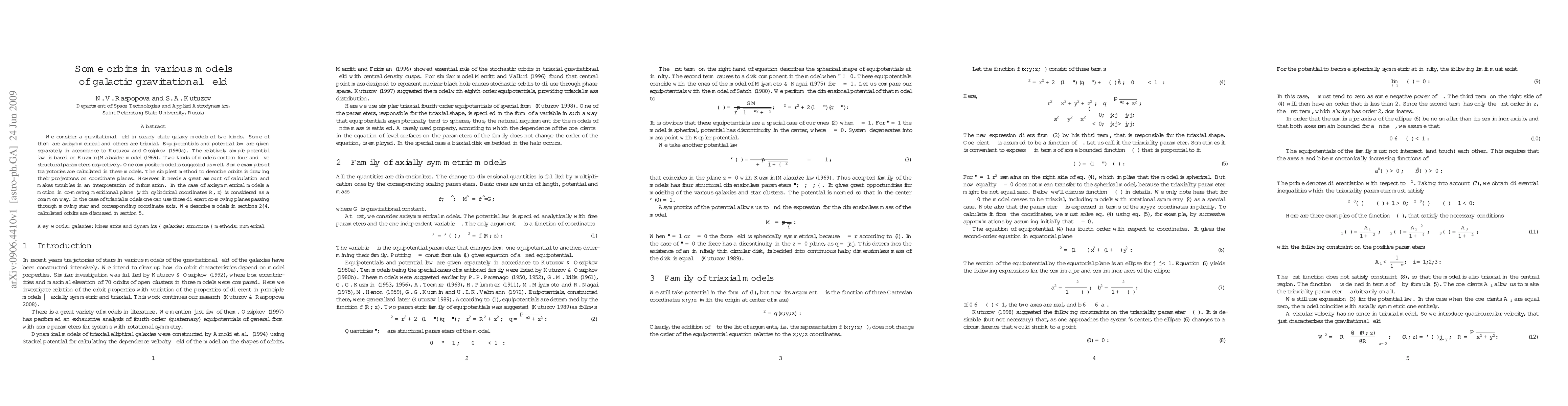We consider a gravitational field in steady state galaxy models of two kinds. Some of them are axisymmetrical and others are triaxial. Equipotentials and potential law are given separately in accordance to Kutuzov and Ossipkov (1980). The relatively simple potential law is based on Kuzmin-Malasidze model (1969). Two kinds of models contain four and five structural parameters respectively. One composite model is suggested as well. Some examples of trajectories are calculated in these models. The simplest method to describe orbits is drawing their projections on coordinate planes. However it needs a great amount of calculation and makes troubles in an interpretation of information. In the case of axisymmetrical models a motion in co-moving meridional plane (with cylindrical coordinates R, z) is considered as a common way. In the case of triaxial models one can use three different co-moving planes passing through moving star and corresponding coordinate axis. We describe models in sections 2-4, calculated orbits are discussed in section 5.