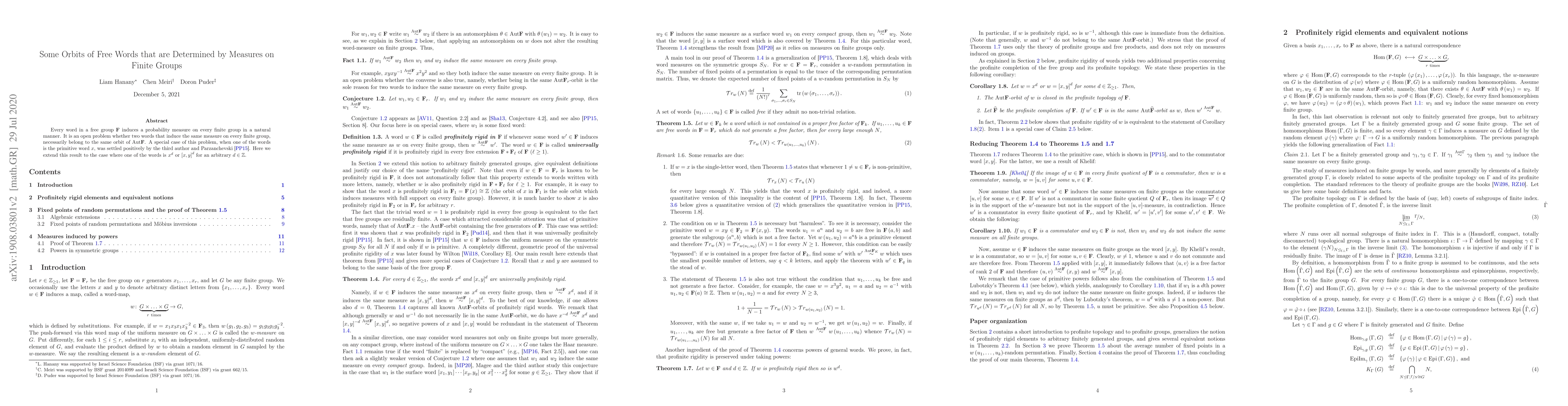 Every word in a free group $F$ induces a probability measure on every finite group in a natural manner. It is an open problem whether two words that induce the same measure on every finite group, necessarily belong to the same orbit of $\mathrm{Aut}F$. A special case of this problem, when one of the words is the primitive word $x$, was settled positively by the third author and Parzanchevski [arXiv:1202.3269]. Here we extend this result to the case where one of the words is $x^d$ or $\left[x,y\right]^{d}$ for an arbitrary $d\in\mathbb{Z}$.