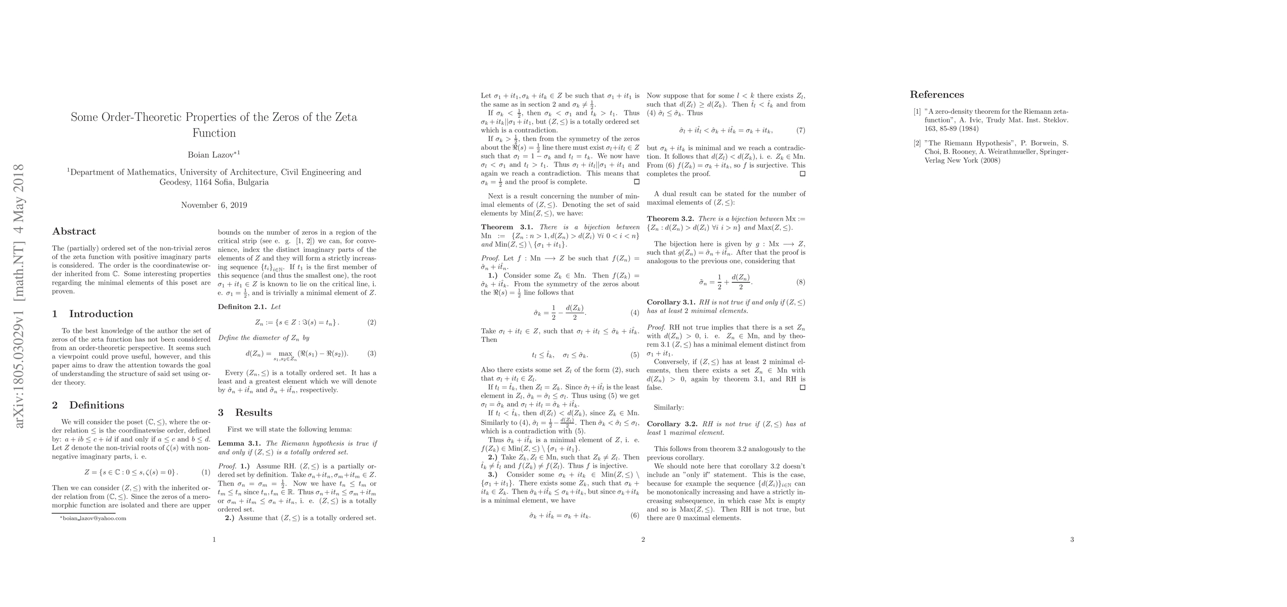 The (partially) ordered set of the non-trivial zeros of the zeta function with positive imaginary parts is considered. The order is the coordinatewise order inherited from $\mathbb{C}$. Some interesting properties regarding the minimal elements of this poset are proven.