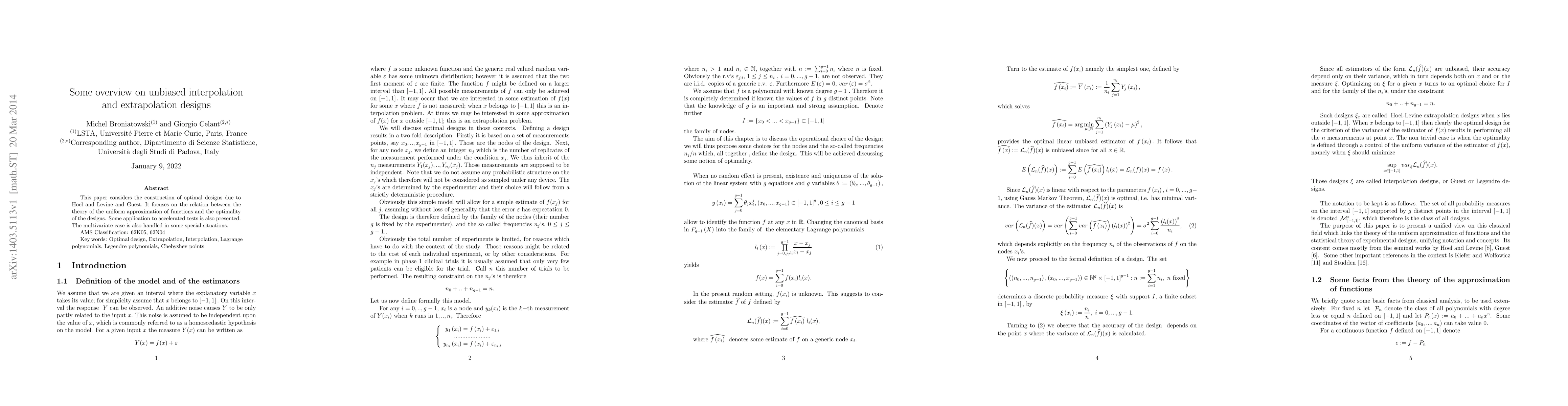 This paper considers the construction of optimal designs due to Hoel and Levine and Guest. It focuses on the relation between the theory of the uniform approximation of functions and the optimality of the designs. Some application to accelerated tests is also presented. The multivariate case is also handled in some special situations.