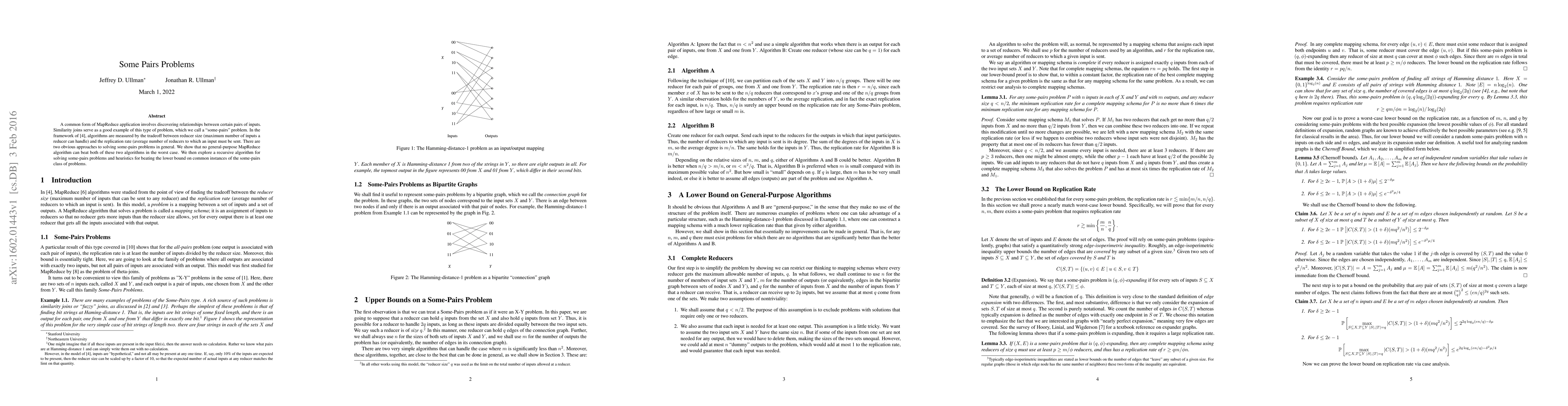 A common form of MapReduce application involves discovering relationships between certain pairs of inputs. Similarity joins serve as a good example of this type of problem, which we call a "some-pairs" problem. In the framework of Afrati et al. (VLDB 2013), algorithms are measured by the tradeoff between reducer size (maximum number of inputs a reducer can handle) and the replication rate (average number of reducers to which an input must be sent. There are two obvious approaches to solving some-pairs problems in general. We show that no general-purpose MapReduce algorithm can beat both of these two algorithms in the worst case. We then explore a recursive algorithm for solving some-pairs problems and heuristics for beating the lower bound on common instances of the some-pairs class of problems.