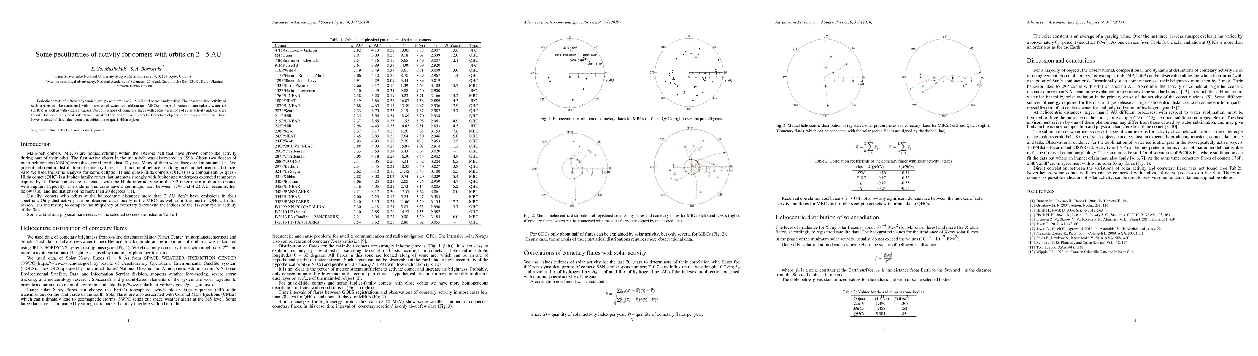 Periodic comets of different dynamical groups with orbits at 2 - 5 AU still occasionally active. The observed dust activity of such objects can be connected with processes of water ice sublimation (MBCs) or crystallization of amorphous water ice (QHCs) as well as with external causes. No connections of cometary flares with cyclic variations of solar activity indexes were found. But some individual solar flares can affect the brightness of comets. Cometary objects in the main asteroid belt have a lower statistic of flares than comets at orbits like quasi-Hilda objects.