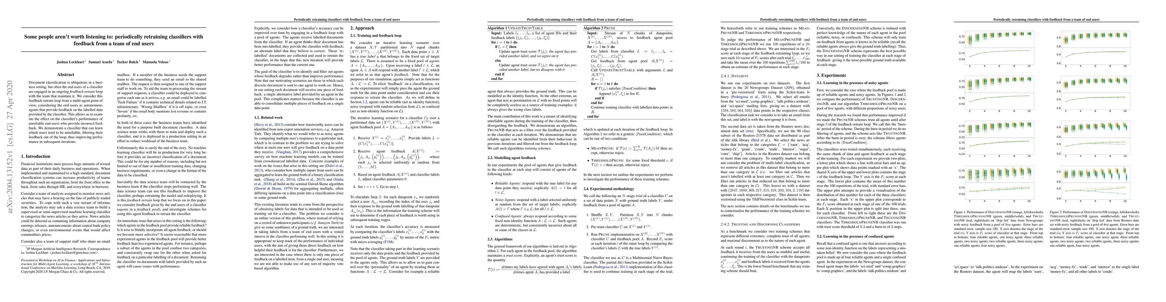 Document classification is ubiquitous in a business setting, but often the end users of a classifier are engaged in an ongoing feedback-retrain loop with the team that maintain it. We consider this feedback-retrain loop from a multi-agent point of view, considering the end users as autonomous agents that provide feedback on the labelled data provided by the classifier. This allows us to examine the effect on the classifier's performance of unreliable end users who provide incorrect feedback. We demonstrate a classifier that can learn which users tend to be unreliable, filtering their feedback out of the loop, thus improving performance in subsequent iterations.