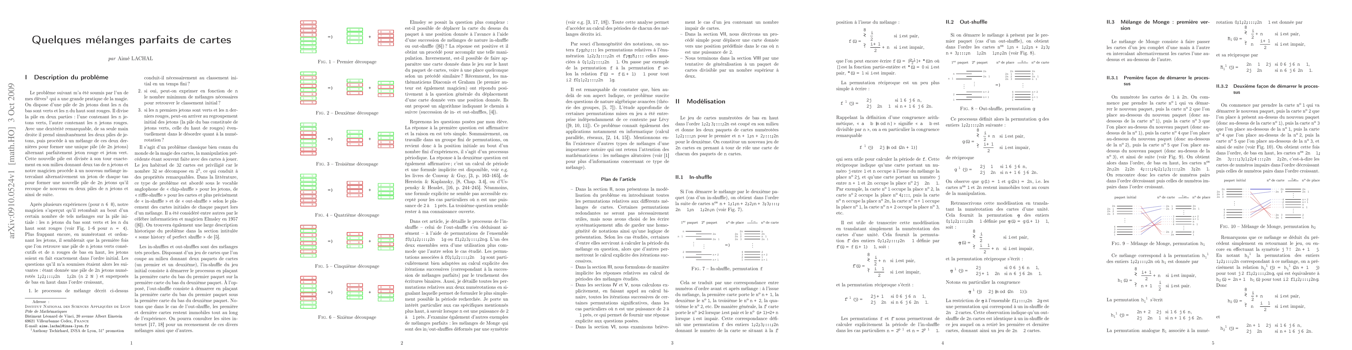 In this paper, we study some cards shuffles which are used by magicians. We focus ourselves on the possibility to hit eventually the initial state after several shuffles. This is a classical problem arising in discrete dynamical systems. The computations are performed through an elementary approach, so the paper is easily accessible. ----- Dans cet article, on \'etudie quelques m\'elanges de cartes bien connus du monde de la magie. On examine en d\'etail l'\'eventualit\'e de reconstituer le jeu de cartes initial apr\`es plusieurs m\'elanges cons\'ecutifs. Il s'agit math\'ematiquement d'un probl\`eme de syst\`emes dynamiques discrets pour lequel on recherche explicitement une p\'eriode. Les calculs \'etant pr\'esent\'es de mani\`ere \'el\'ementaire, l'article se veut accessible \`a un large public.
