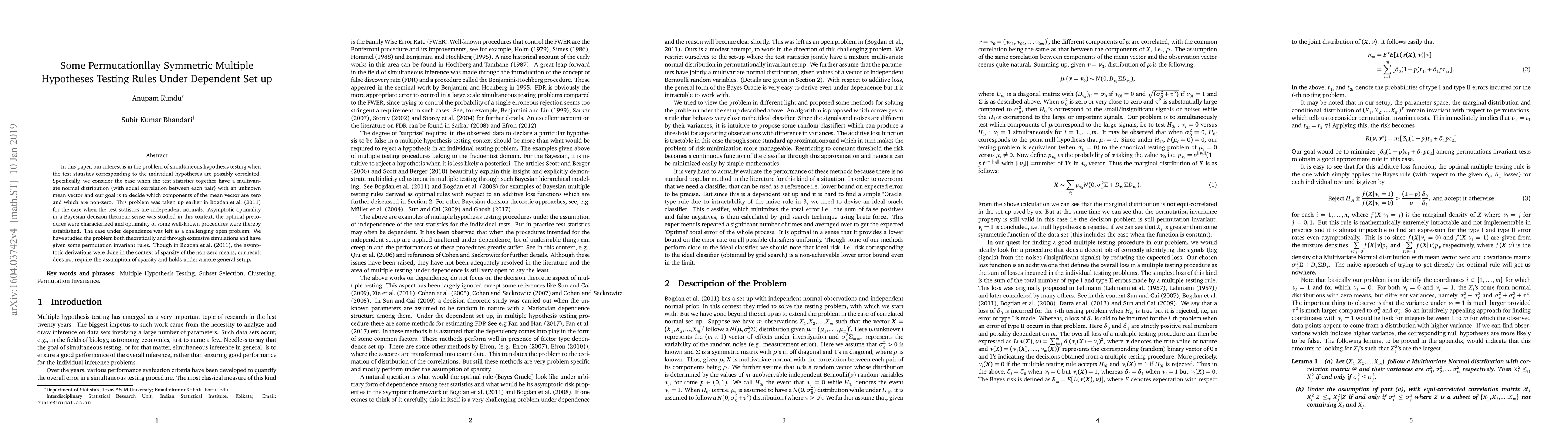 This paper addresses simultaneous hypothesis testing under dependence, proposing permutation invariant rules for deciding which components of a multivariate normal distribution's mean vector are zero. Unlike previous work, it does not assume sparsity and is validated both theoretically and through simulations.