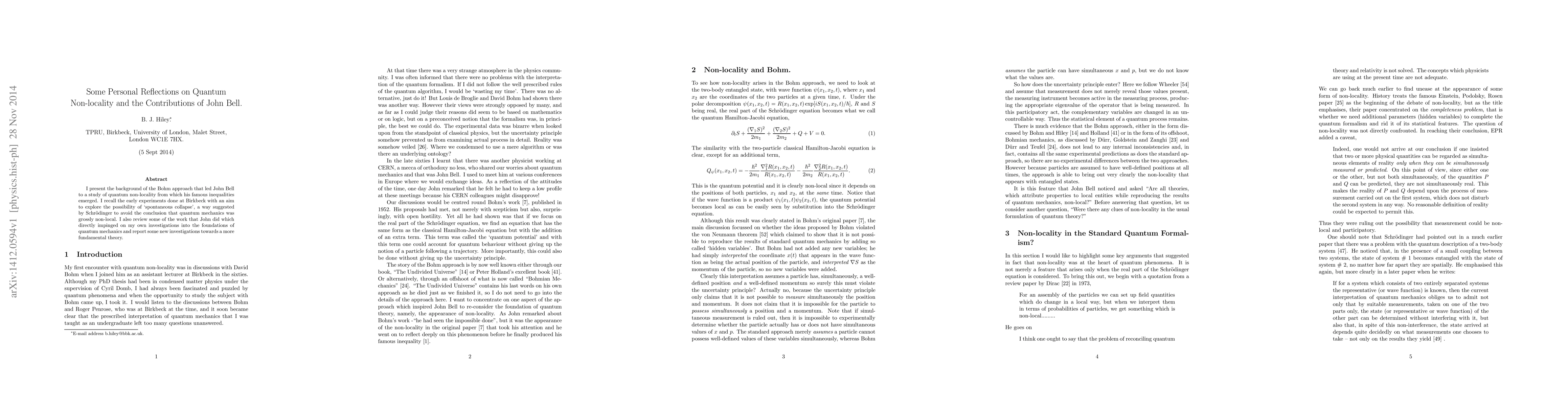 I present the background of the Bohm approach that led John Bell to a study of quantum non-locality from which his famous inequalities emerged. I recall the early experiments done at Birkbeck with an aim to explore the possibility of `spontaneous collapse', a way suggested by Schr\"{o}dinger to avoid the conclusion that quantum mechanics was grossly non-local. I also review some of the work that John did which directly impinged on my own investigations into the foundations of quantum mechanics and report some new investigations towards a more fundamental theory.