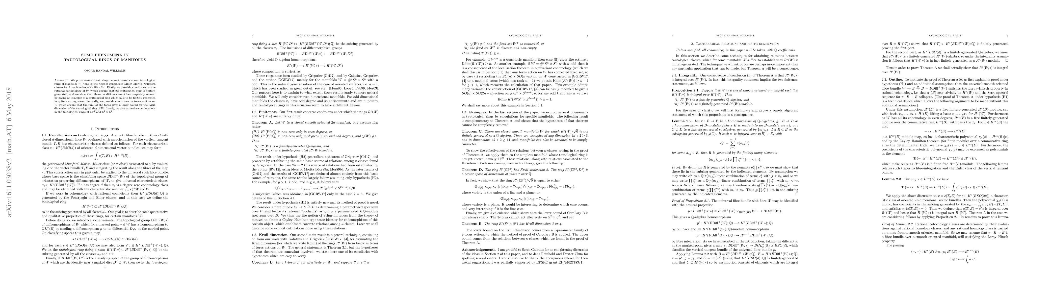 This paper establishes ring-theoretic properties of tautological rings of manifolds, including conditions ensuring their finite generation and Krull dimension lower bounds. It also provides detailed computations for specific examples like CP^2 and S^2 x S^2.