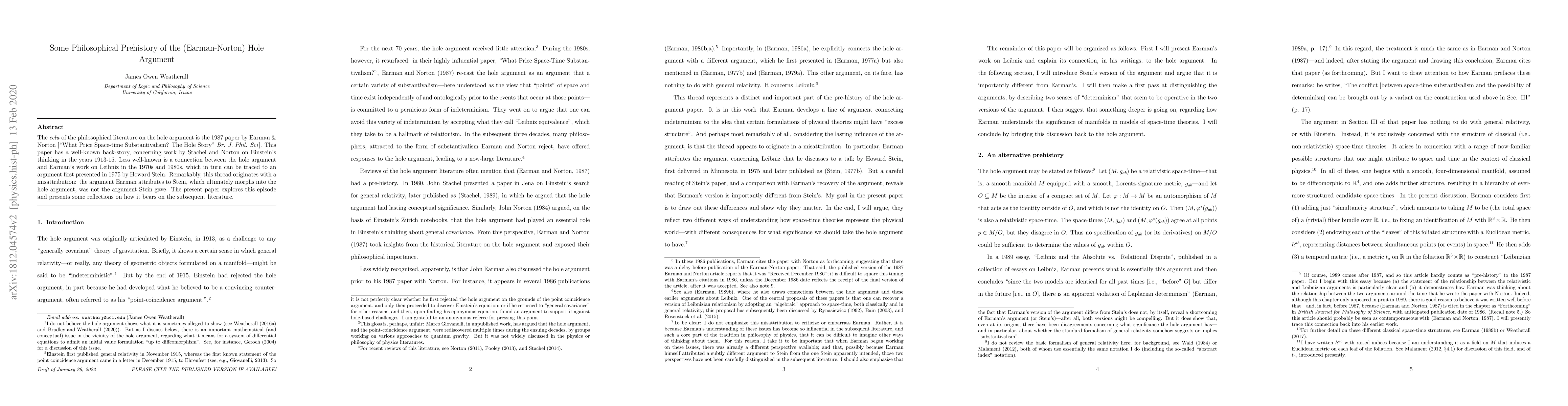 This paper explores the philosophical origins of the Earman-Norton hole argument, tracing its roots back to Earman's work on Leibniz in the 1970s and 1980s, and revealing a misattribution in the argument's history that ultimately connects to Howard Stein's earlier work. The study reflects on the implications of this misattribution for the subsequent philosophical literature.