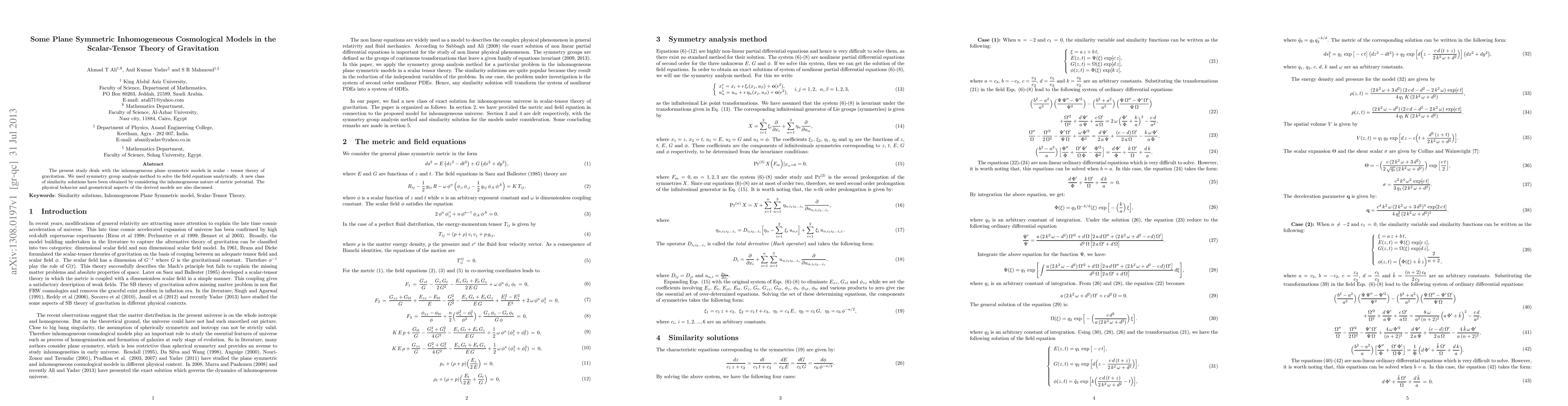 This paper explores inhomogeneous plane symmetric cosmological models within scalar-tensor theory using symmetry group analysis to derive new similarity solutions. The study discusses the physical behavior and geometrical implications of these derived models.