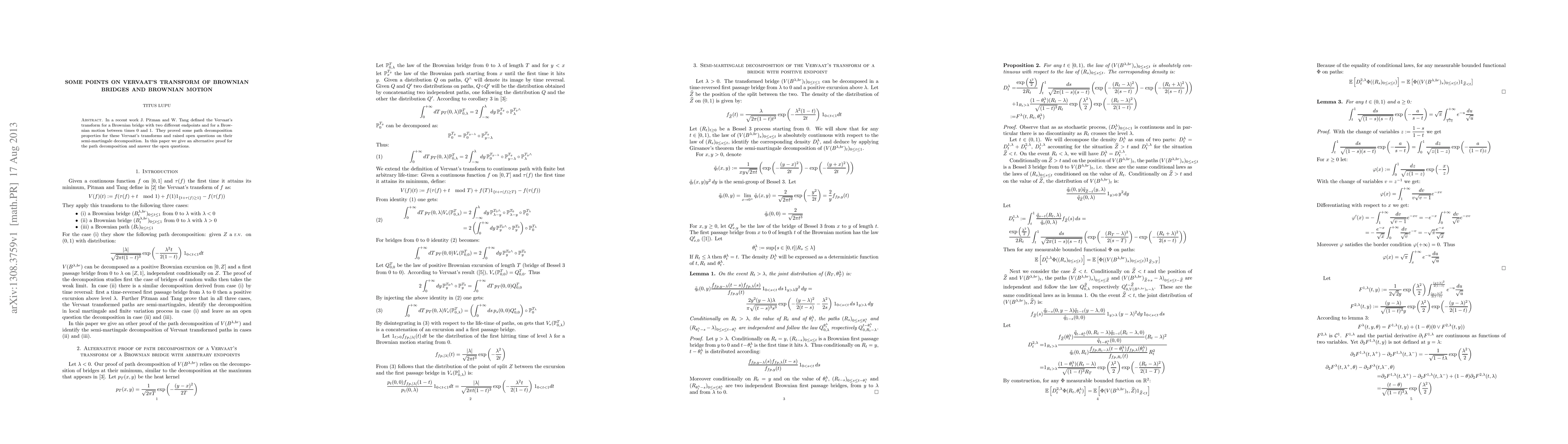 This paper provides an alternative proof for the path decomposition properties of Vervaat's transform defined by Pitman and Tang for Brownian bridges and Brownian motion. It also addresses the open questions regarding their semi-martingale decomposition.