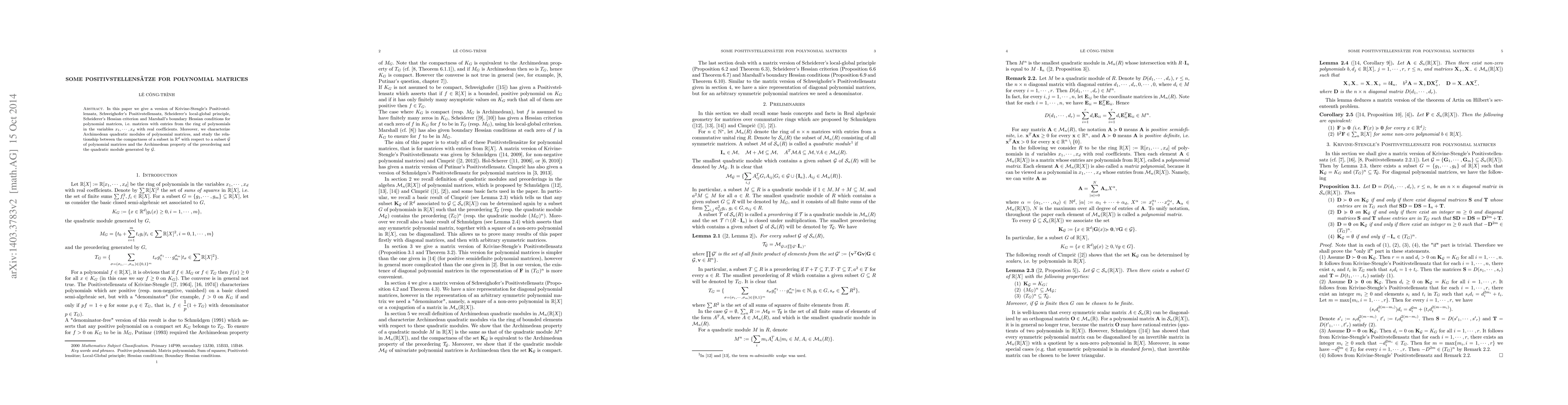 In this paper we give a version of Krivine-Stengle's Positivstellensatz, Schweighofer's Positivstellensatz, Scheiderer's local-global principle, Scheiderer's Hessian criterion and Marshall's boundary Hessian conditions for polynomial matrices, i.e. matrices with entries from the ring of polynomials in the variables (x_1,...,x_d) with real coefficients. Moreover, we characterize Archimedean quadratic modules of polynomial matrices, and study the relationship between the compactness of a subset in (\r^{d}) with respect to a subset (\hoa{G}) of polynomial matrices and the Archimedean property of the preordering and the quadratic module generated by (\hoa{G}).