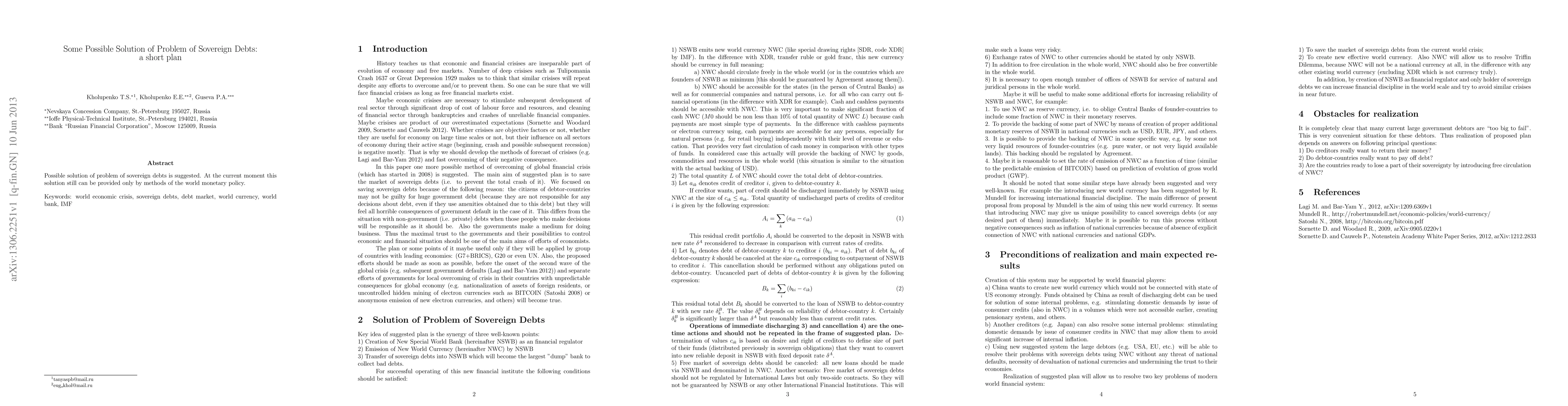 The paper proposes a solution for sovereign debt issues, currently feasible through world monetary policy methods. It suggests a short plan without specifying detailed implementation.