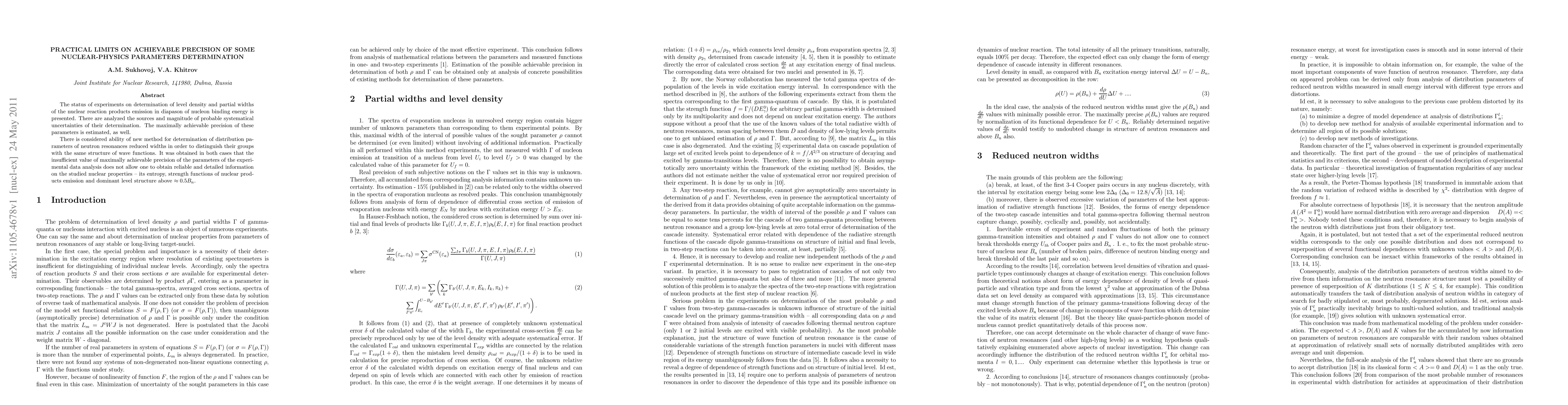 The status of experiments on determination of level density and partial widths of the nuclear reaction products emission in diapason of nucleon binding energy is presented. There are analyzed the sources and magnitude of probable systematical uncertainties of their determination. The maximally achievable precision of these parameters is estimated, as well. There is considered ability of new method for determination of distribution parameters of neutron resonances reduced widths in order to distinguish their groups with the same structure of wave functions. It was obtained in both cases that the insufficient value of maximally achievable precision of the parameters of the experimental data analysis does not allow one to obtain reliable and detailed information on the studied nuclear properties -- its entropy, strength functions of nuclear products emission and dominant level structure above 0.5Bn.