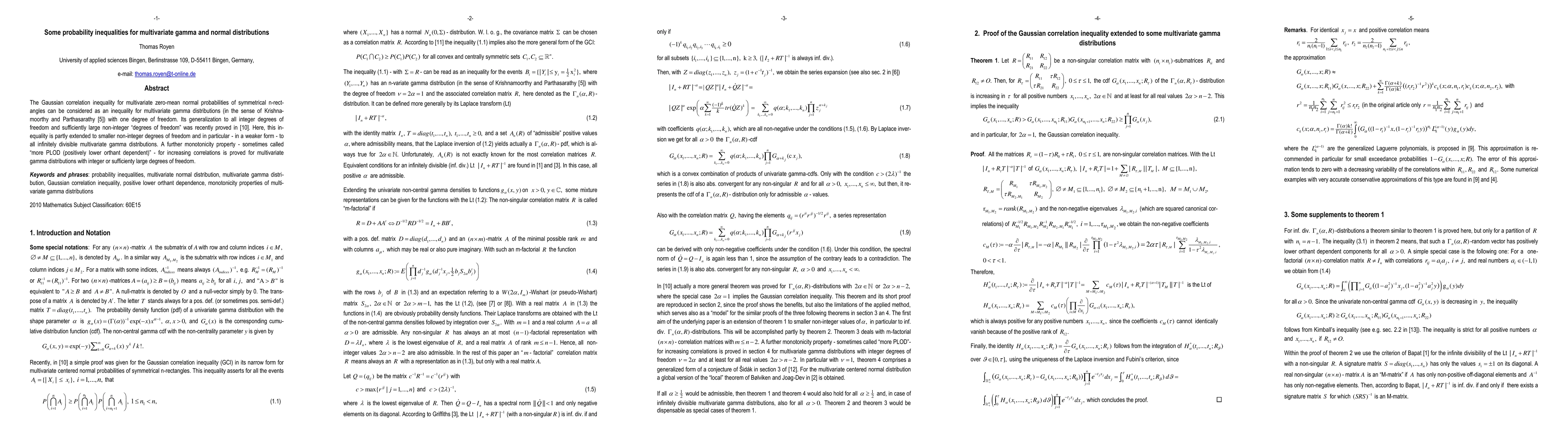 The paper presents novel extensions of probability inequalities for multivariate gamma and normal distributions, proving generalized Gaussian correlation inequalities and a monotonicity property for increasing correlations under specific conditions.