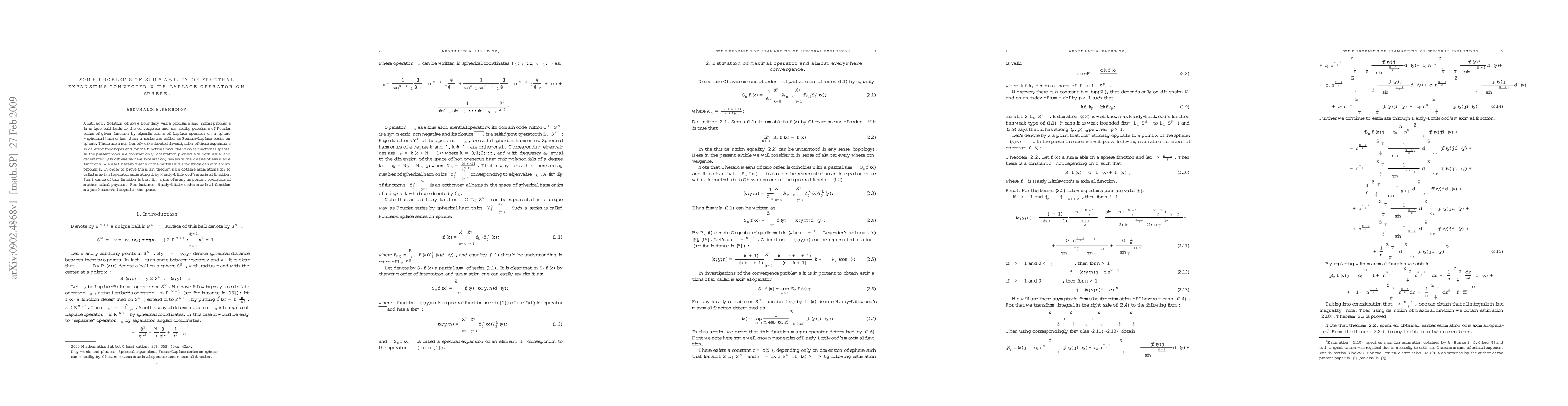 Solution of some boundary value problems and initial problems in unique ball leads to the convergence and sumability problems of Fourier series of given function by eigenfunctions of Laplace operator on a sphere - spherical harmonics. Such a series are called as Fourier-Laplace series on sphere. There are a number of works devoted investigation of these expansions in different topologies and for the functions from the various functional spaces. In the present work we consider only localization problems in both usual and generalized (almost everywhere localization) senses in the classes of summable functions. We use Chezaro means of the partial sums for study of summability problems. In order to prove the main theorems we obtaine estimations for so called maximal operator estimating it by Hardy-Littlwood's maximal function. Significance of this function is that it majors of many important operators of mathematical physics. For instance, Hardy-Littlewood's maximal function majors Poisson's integral in the space.