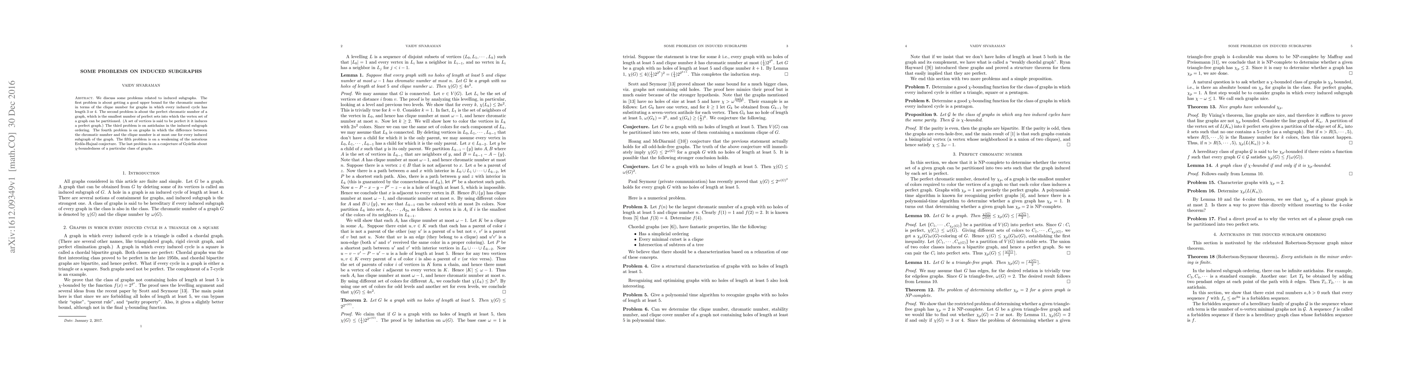 We discuss some problems related to induced subgraphs. The first problem is about getting a good upper bound for the chromatic number in terms of the clique number for graphs in which every induced cycle has length $3$ or $4$. The second problem is about the perfect chromatic number of a graph, which is the smallest number of perfect sets into which the vertex set of a graph can be partitioned. (A set of vertices is said to be perfect it it induces a perfect graph.) The third problem is on antichains in the induced subgraph ordering. The fourth problem is on graphs in which the difference between the chromatic number and the clique number is at most one for every induced subgraph of the graph. The fifth problem is on a weakening of the notorious Erd\H{o}s-Hajnal conjecture. The last problem is on a conjecture of Gy\'{a}rf\'{a}s about $\chi$-boundedness of a particular class of graphs.