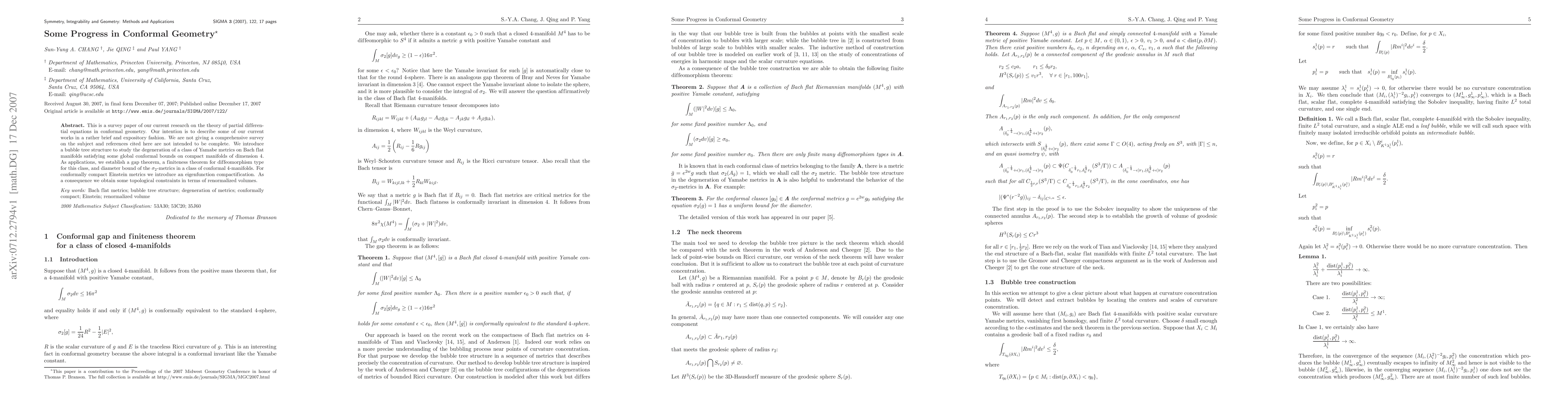 This is a survey paper of our current research on the theory of partial differential equations in conformal geometry. Our intention is to describe some of our current works in a rather brief and expository fashion. We are not giving a comprehensive survey on the subject and references cited here are not intended to be complete. We introduce a bubble tree structure to study the degeneration of a class of Yamabe metrics on Bach flat manifolds satisfying some global conformal bounds on compact manifolds of dimension 4. As applications, we establish a gap theorem, a finiteness theorem for diffeomorphism type for this class, and diameter bound of the $\sigma_2$-metrics in a class of conformal 4-manifolds. For conformally compact Einstein metrics we introduce an eigenfunction compactification. As a consequence we obtain some topological constraints in terms of renormalized volumes.