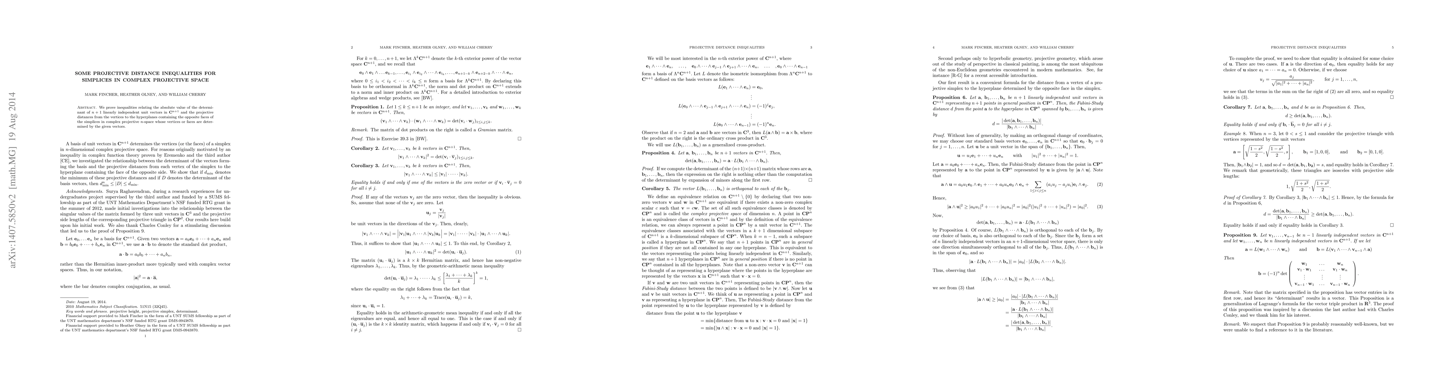 This paper establishes inequalities linking the determinant of n+1 unit vectors in an n+1 dimensional complex vector space to the projective distances from simplices' vertices to hyperplanes containing opposite faces in complex projective n-space. These inequalities provide insights into geometric properties of simplices.