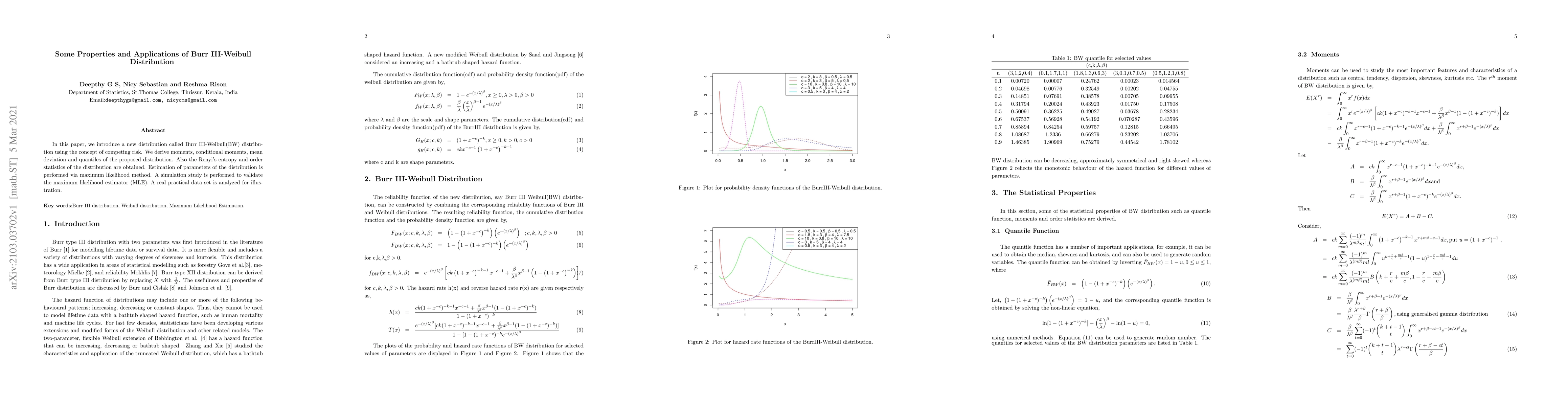 In this paper, we introduce a new distribution called Burr III-Weibull(BW) distribution using the concept of competing risk. We derive moments, conditional moments, mean deviation and quantiles of the proposed distribution. Also the Renyi's entropy and order statistics of the distribution are obtained. Estimation of parameters of the distribution is performed via maximum likelihood method. A simulation study is performed to validate the maximum likelihood estimator (MLE). A real practical data set is analyzed for illustration.
