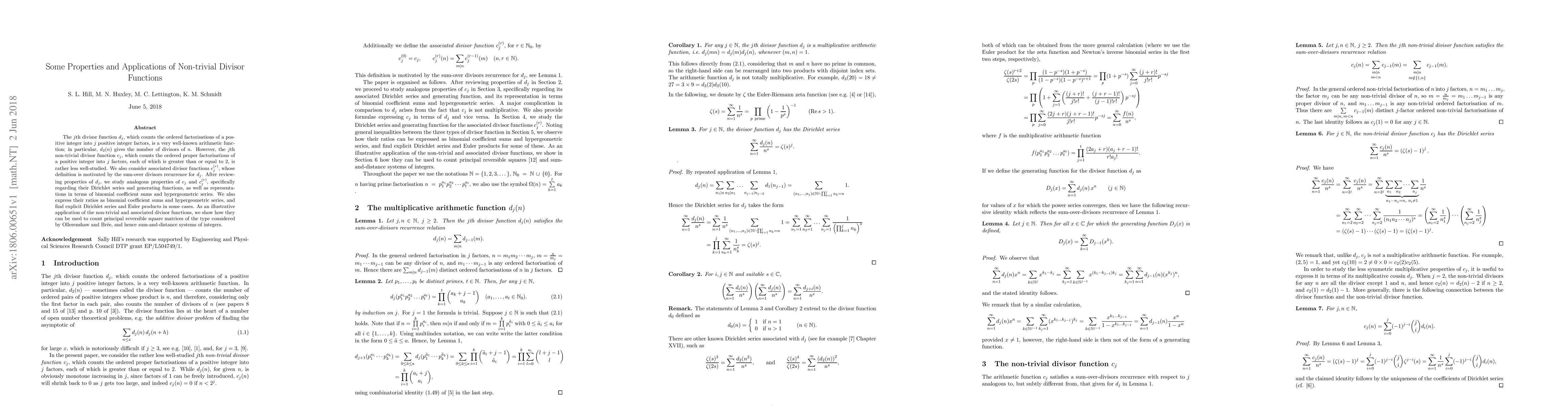 The $j$th divisor function $d_j$, which counts the ordered factorisations of a positive integer into $j$ positive integer factors, is a very well-known arithmetic function; in particular, $d_2(n)$ gives the number of divisors of $n$. However, the $j$th non-trivial divisor function $c_j$, which counts the ordered proper factorisations of a positive integer into $j$ factors, each of which is greater than or equal to 2, is rather less well-studied. We also consider associated divisor functions $c_j^{(r)}$, whose definition is motivated by the sum-over divisors recurrence for $d_j$. After reviewing properties of $d_j$, we study analogous properties of $c_j$ and $c_j^{(r)}$, specifically regarding their Dirichlet series and generating functions, as well as representations in terms of binomial coefficient sums and hypergeometric series. We also express their ratios as binomial coefficient sums and hypergeometric series, and find explicit Dirichlet series and Euler products in some cases. As an illustrative application of the non-trivial and associated divisor functions, we show how they can be used to count principal reversible square matrices of the type considered by Ollerenshaw and Br\'ee, and hence sum-and-distance systems of integers.
