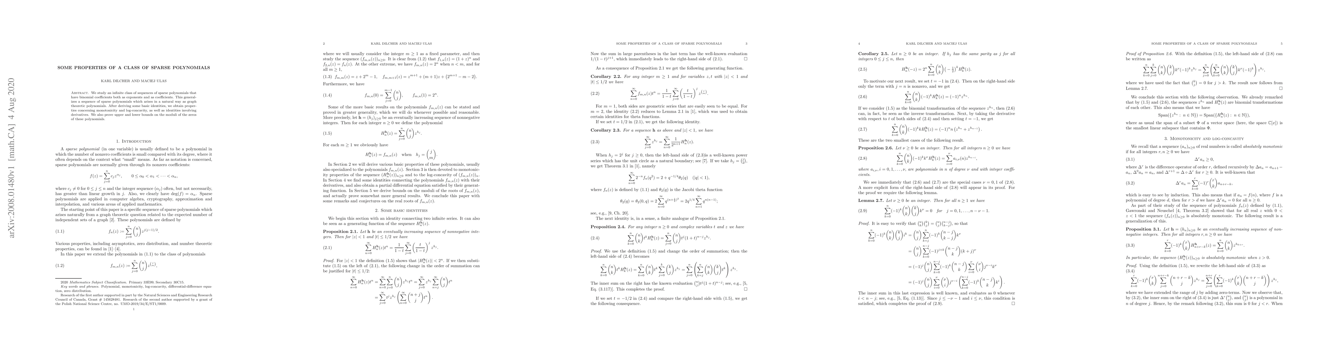 This paper investigates an infinite class of sparse polynomials characterized by binomial coefficients in both exponents and coefficients, deriving identities, properties of monotonicity and log-concavity, and bounds on the moduli of their zeros. The study generalizes a sequence linked to graph theory.