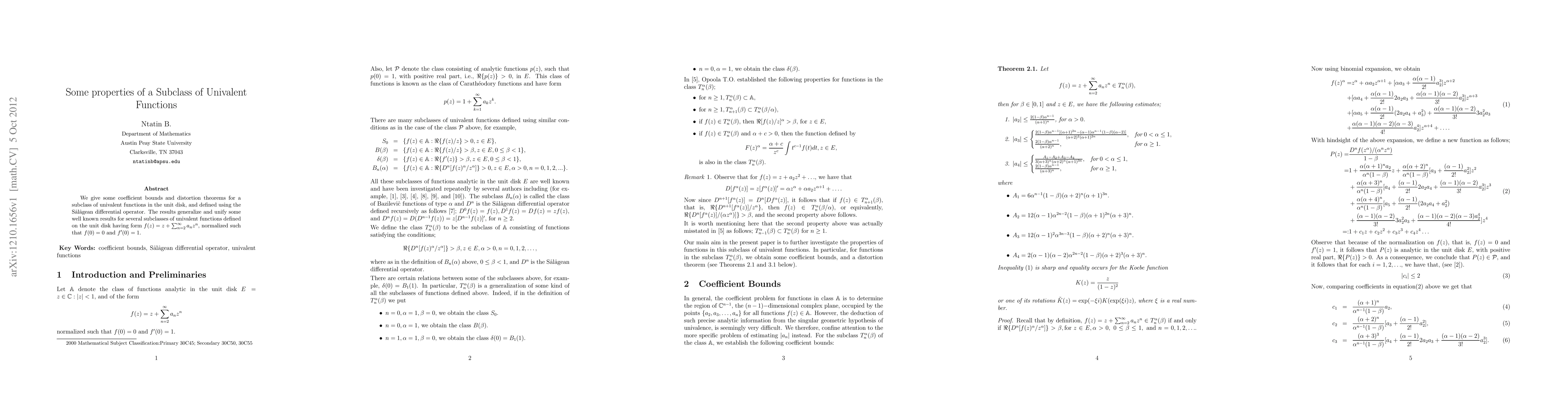 We give some coefficient bounds and distortion theorems for a subclass of univalent functions in the unit disk, and defined using the S\^{a}l\^{a}gean differential operator. The results generalize and unify some well known results for several subclasses of univalent functions defined on the unit disk having form $f(z)=z+\sum_{n=2}^{\infty}a_nz^n$, normalized such that $f(0)=0$ and $f^\prime(0)=1$.