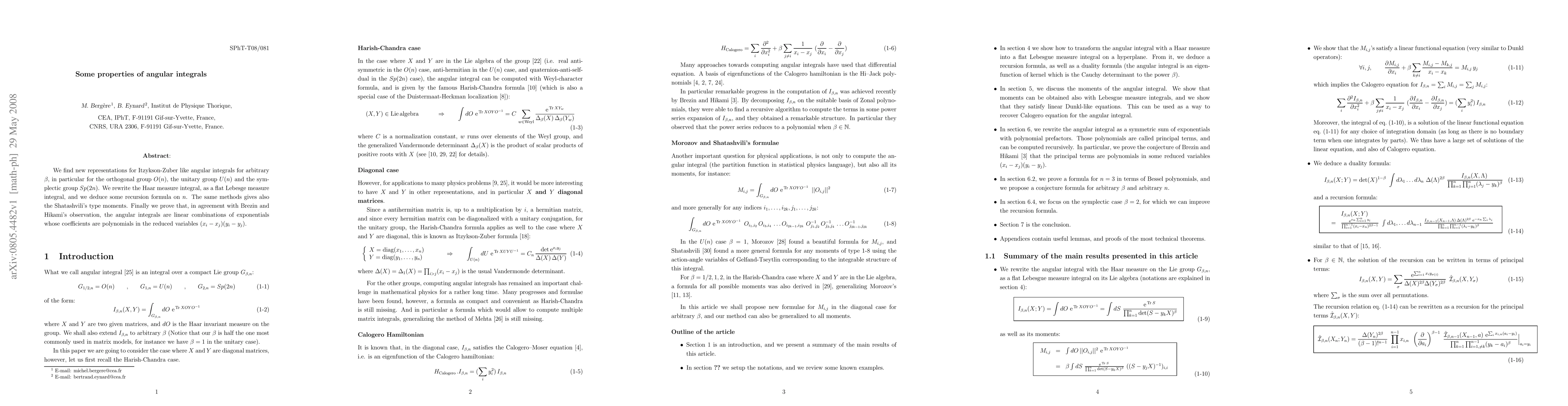 We find new representations for Itzykson-Zuber like angular integrals for arbitrary beta, in particular for the orthogonal group O(n), the unitary group U(n) and the symplectic group Sp(2n). We rewrite the Haar measure integral, as a flat Lebesge measure integral, and we deduce some recursion formula on n. The same methods gives also the Shatashvili's type moments. Finally we prove that, in agreement with Brezin and Hikami's observation, the angular integrals are linear combinations of exponentials whose coefficients are polynomials in the reduced variables (x_i-x_j)(y_i-y_j).