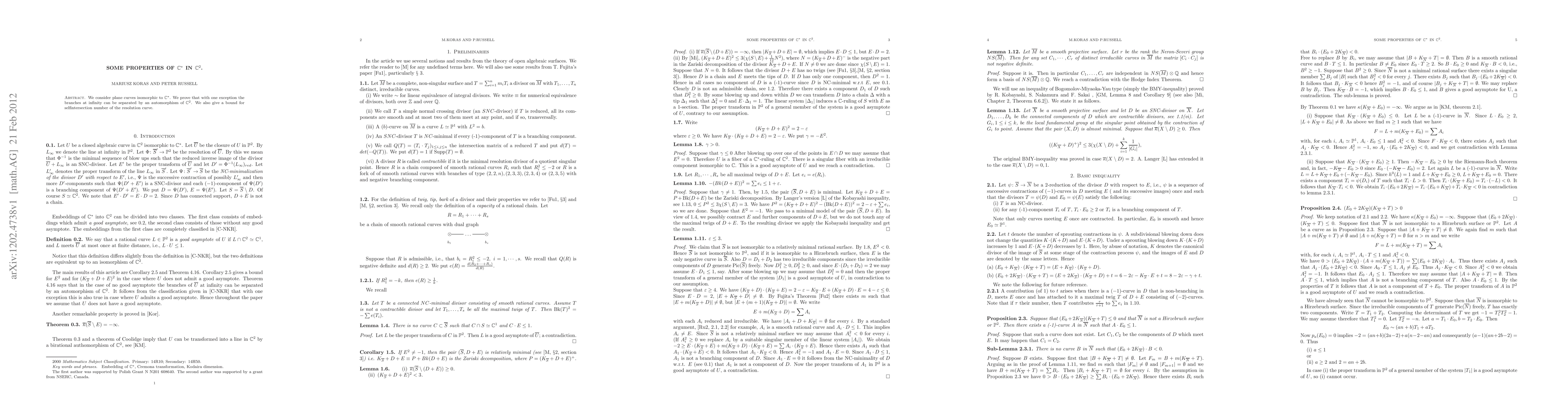 Researchers studied plane curves isomorphic to C*, finding that most branches at infinity can be separated by an automorphism of C^2, with one exception, and providing a bound for the selfintersection number of the resolution curve.