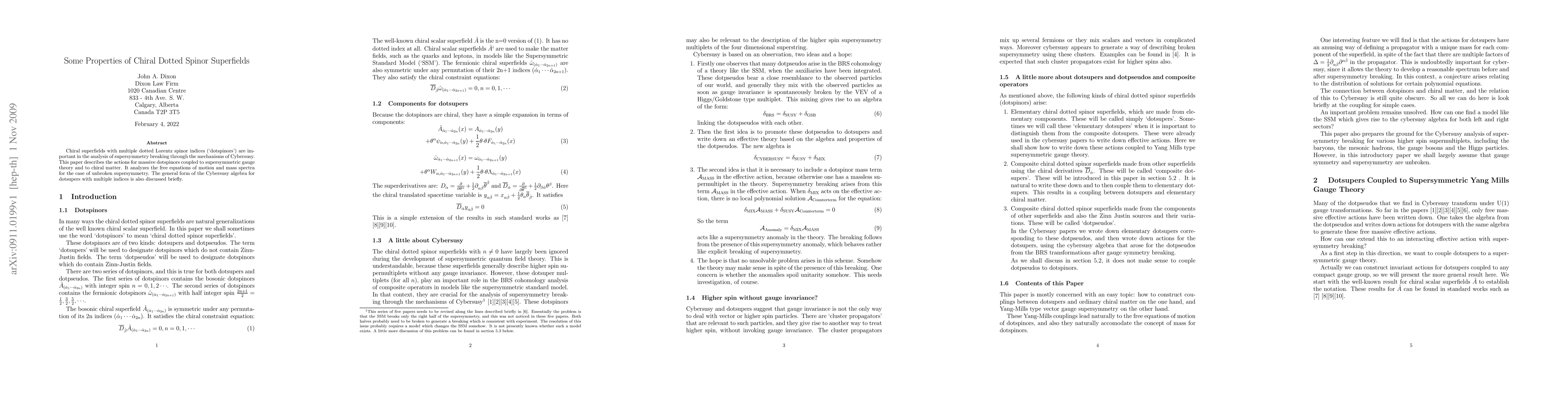 Chiral superfields with multiple dotted Lorentz spinor indices (`dotspinors') are important in the analysis of supersymmetry breaking through the mechanisms of Cybersusy. This paper describes the actions for massive dotspinors coupled to supersymmetric gauge theory and to chiral matter. It analyzes the free equations of motion and mass spectra for the case of unbroken supersymmetry. The general form of the Cybersusy algebra for dotsupers with multiple indices is also discussed briefly.