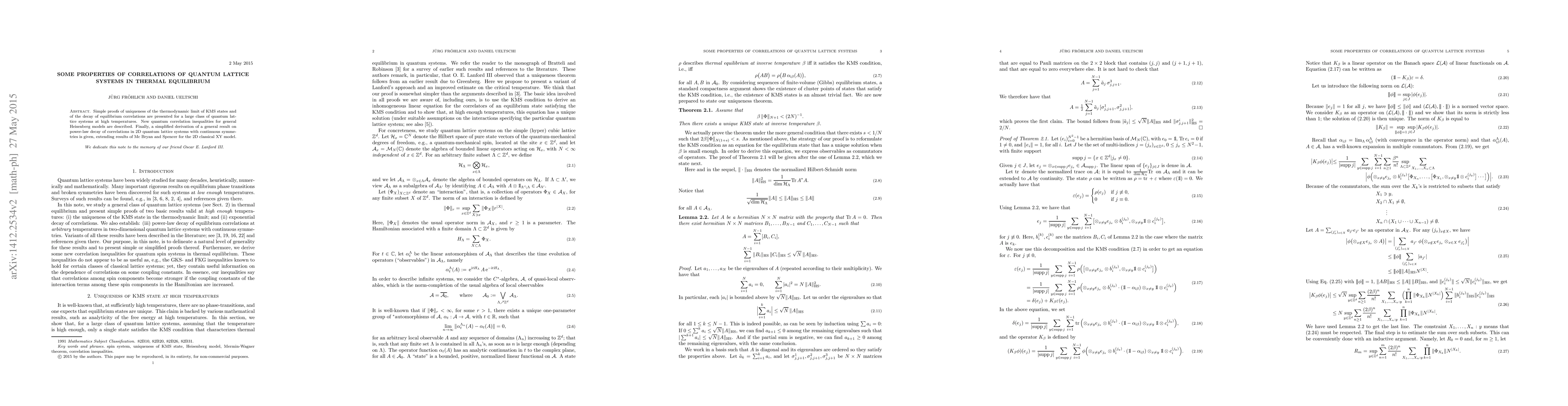 This paper proves the uniqueness of the thermodynamic limit for KMS states and the decay of equilibrium correlations in quantum lattice systems at high temperatures, introduces new quantum correlation inequalities for Heisenberg models, and simplifies the derivation of power-law decay of correlations in 2D quantum lattice systems with continuous symmetries.