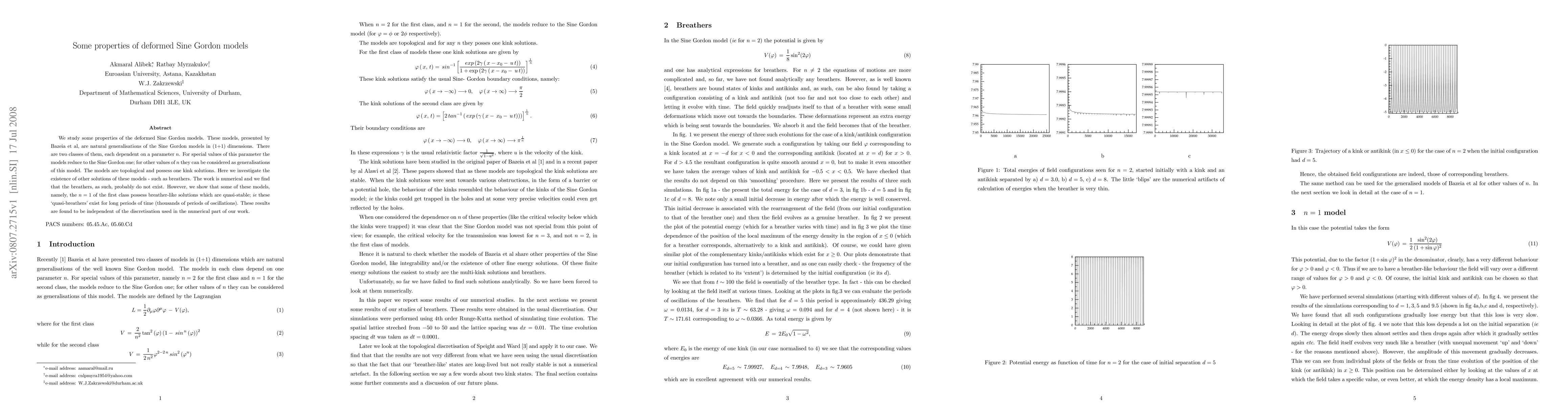 We study some properties of the deformed Sine Gordon models. These models, presented by Bazeia et al, are natural generalisations of the Sine Gordon models in (1+1) dimensions. There are two classes of them, each dependent on a parameter n. For special values of this parameter the models reduce to the Sine Gordon one; for other values of n they can be considered as generalisations of this model. The models are topological and possess one kink solutions. Here we investigate the existence of other solutions of these models - such as breathers. The work is numerical and we find that the breathers, as such, probably do not exist. However, we show that some of these models, namely, the n = 1 of the first class possess breather-like solutions which are quasi-stable; ie these quasi-breathers exist for long periods of time (thousands of periods of oscillations). These results are found to be independent of the discretisation used in the numerical part of our work.